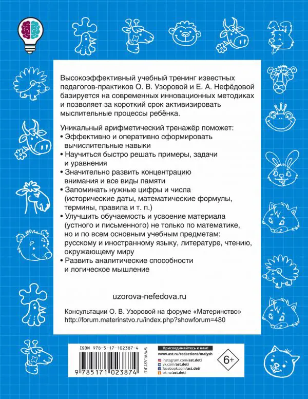 Новое учебное пособие известных педагогов-практиков О. В. Узоровой и Е. А. Нефёдовой поможет школьнику быстро научиться счёту в пределах 100. Книга представляет интерес для педагогов и родителей младших школьников: поможет развить вычислительные навыки ребенка,а также может использоваться при подготовке к урокам. • Уникальный арифметический тренажёр позволит оценить достижения младших школьников по математике. • Системный комплекс занятий принесёт максимум пользы ребенку — это отработка базовых школьных примеров по устному и письменному счёту, а также инструмент активизации мыслительных процессов. • Материал строится по принципу «Одна страница книги на каждое занятие». • Благодаря ежедневным занятиям по 20–30 минут ученик сможет автоматизировать навыки счёта и эффективно применять их на уроках. • Многообразие интересных заданий позволит школьнику заниматься с интересом и удовольствием.