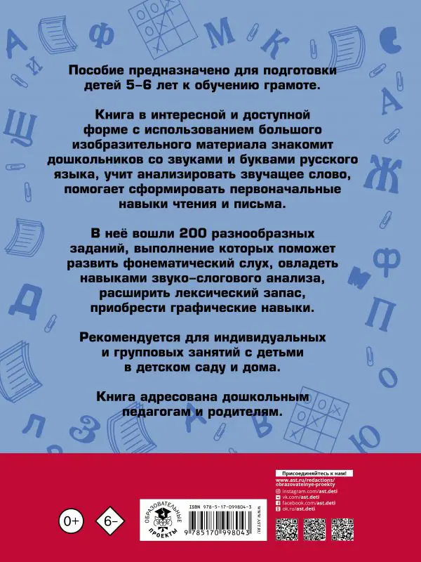 В книгу вошли 200 разнообразных заданий, выполнение которых поможет развить фонематический слух, овладеть навыками звуко-слогового анализа, расширить лексический запас, приобрести графические навыки.