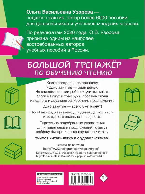 О чём эта книга Учебное пособие известных педагогов-практиков О. В. Узоровой и Е. А. Нефёдовой поможет ребёнку автоматизировать навык слогового чтения. Кому эта книга будет интересна Будущим первоклассникам для подготовки к школе, а также первоклассникам, которые хотят усовершенствовать технику чтения. Каковы особенности этой книги • Отличное пособие для подготовки ребёнка к школе. • Содержит упражнения для обучения чтению детей дошкольного и младшего школьного возраста. • Поможет развить навык смыслового чтения. • Ребёнок научится читать в определённом темпе. • Даны упражнения на развитие речи. • Регулярные занятия подготовят ребёнка к чтению слов, предложений и текстов. • Поможет расширить словарный запас, привить любовь к чтению.
