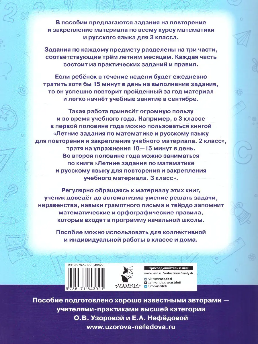 Такая работа принесёт огромную пользу и во время учебного года. Например, в 3 классе в первой половине года можно пользоваться книгой "Летние задания по математике и русскому языку для повторения и закрепления учебного материала. 2 класс", тратя на упражнения 10—15 минут в день. Во второй половине года можно заниматься по книге "Летние задания по математике и русскому языку для повторения и закрепления учебного материала. 3 класс".