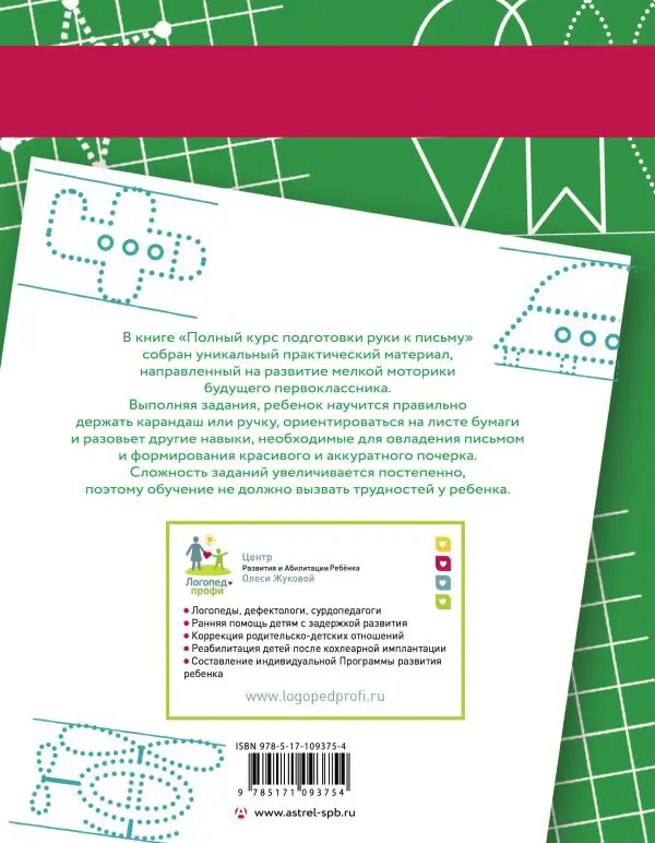 В книге "Полный курс подготовки руки к письму" собран уникальный практический материал, направленный на развитие мелкой моторики будущего первоклассника. Выполняя задания, ребенок научится правильно держать карандаш или ручку, ориентироваться на листе бумаги, разовьет другие навыки, необходимые для овладения письмом. Сложность заданий увеличивается постепенно, поэтому обучение не должно вызвать трудностей у ребенка.