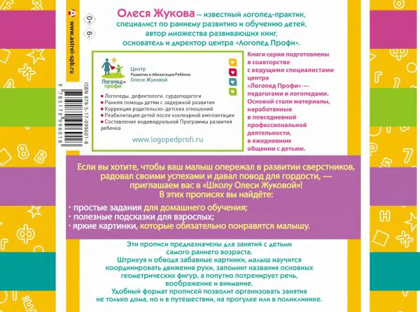 Олеся Жукова – известный логопед-практик, автор множества развивающих книг. В основу книг серии легли материалы, наработанные в повседневной профессиональной деятельности, в ежедневном общении с детьми. Эта серия обязательно заинтересует родителей и детей, так как помимо простых и эффективных «уроков» для домашнего обучения они найдут в ней яркие цветные картинки игры и полезные подсказки для взрослых. Выполняя задания, малыш научится координировать движения руки, запомнит названия геометрических фигур, потренирует речь и внимание.