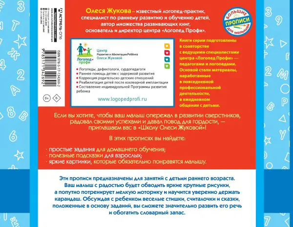 Если вы хотите, чтобы ваш малыш опережал в развитии сверстников, радовал своими успехами и давал повод для гордости — приглашаем вас в «Школу Олеси Жуковой»! В основу книг серии легли материалы, наработанные в повседневной профессиональной деятельности, в ежедневном общении с детьми. Выполняя простые, но эффективные задания, малыш: • научится уверенно держать карандаш или фломастер; • обогатит свою речь, благодаря веселым стишкам, сопровождающим занятия; • значительно пополнит словарный запас и расширит кругозор.