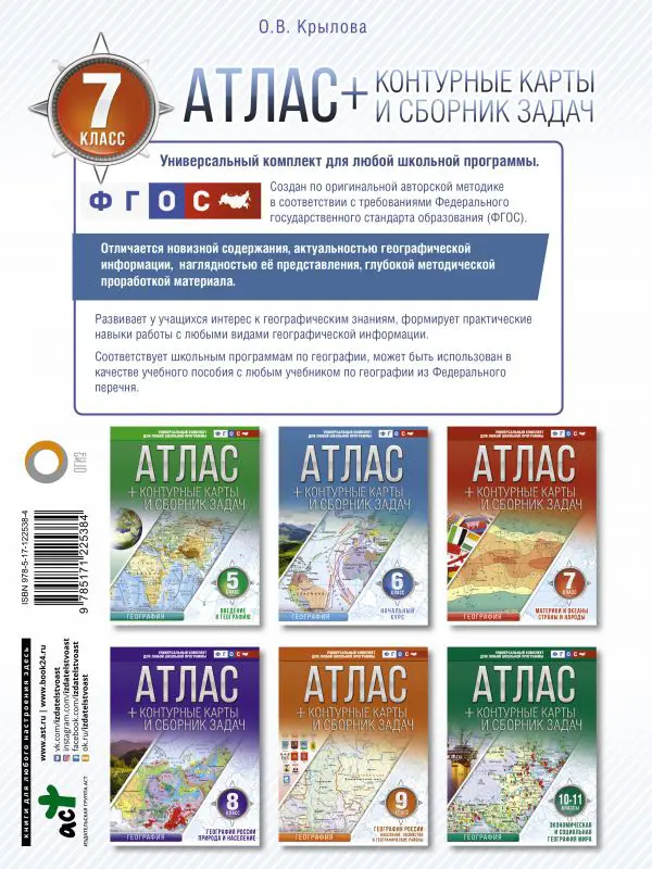Универсальный учебно-методический комплект по географии для 7-го класса (автор – О.В. Крылова) включает в себя атлас "Материки и океаны. Страны и народы", сборник задач по работе с атласом и контурные карты с учебными заданиями.