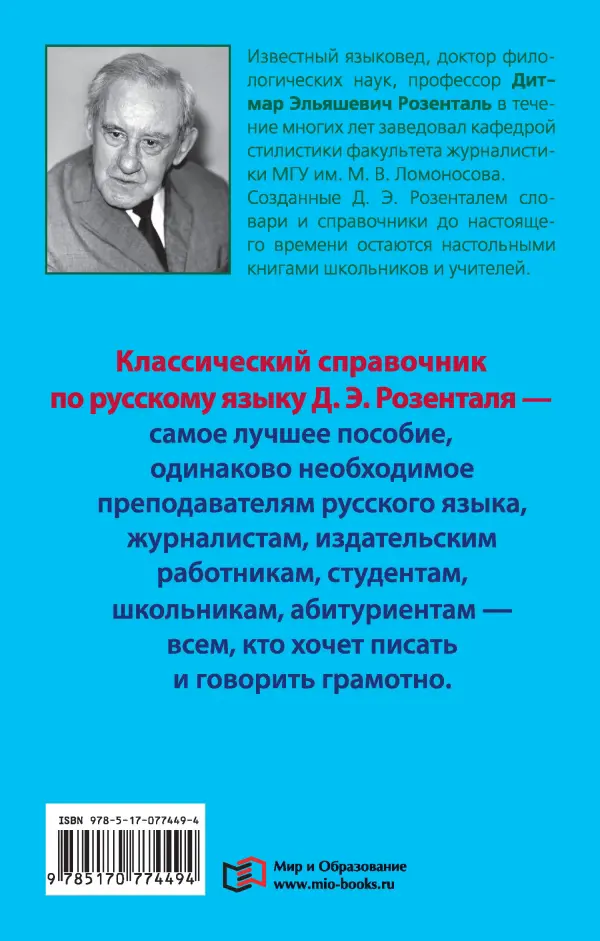 Классический справочник по русскому языку Д. Э. Розенталя охватывает всю систему орфографии и пунктуации. В орфографический словарь включены наиболее употребляемые слова и их формы, в написании которых возникают трудности. Это самое лучшее пособие, одинаково необходимое преподавателям русского языка, журналистам, издательским работникам, студентам, школьникам, абитуриентам — всем, кто хочет писать и говорить грамотно.