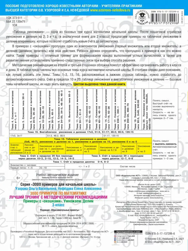 "Таблица умножения" - одна из базовых тем курса математики начальной школы. После пошаговой отработки умножения и деления на 2, на 3 и т.д. (в аналогичной книге для 2 класса) предлагаем примеры на табличное умножение и деление вперемешку, которые позволят отработать навык счёта до автоматизма.