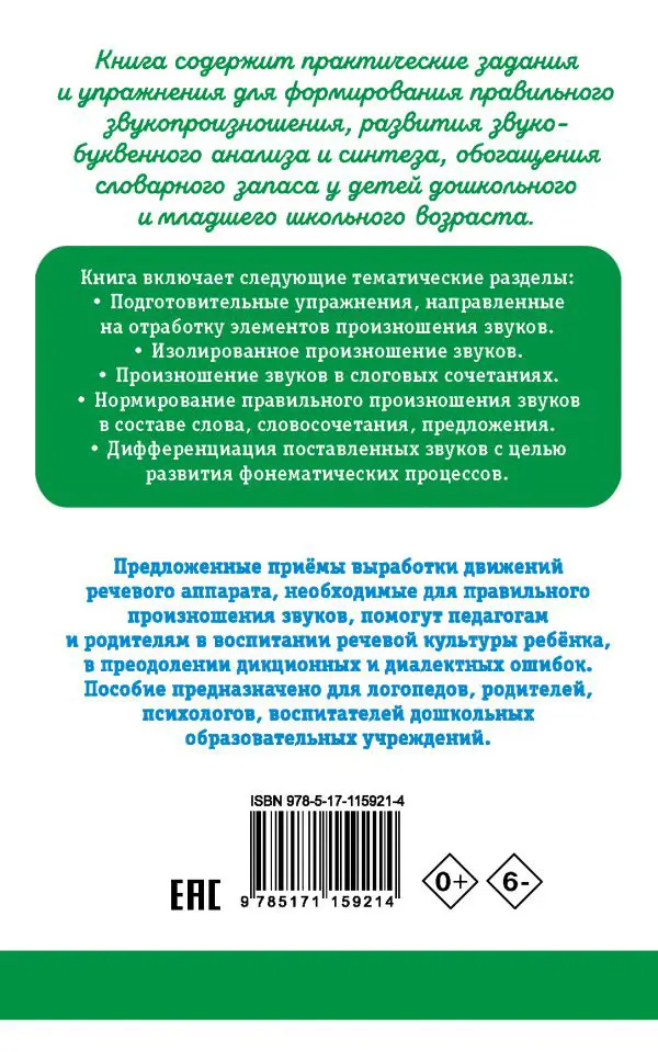 Книга содержит практические задания и упражнения для формирования правильного звукопроизношения, развития звуко-буквенного анализа и синтеза, обогащения словарного запаса у детей дошкольного и младшего школьного возраста.
