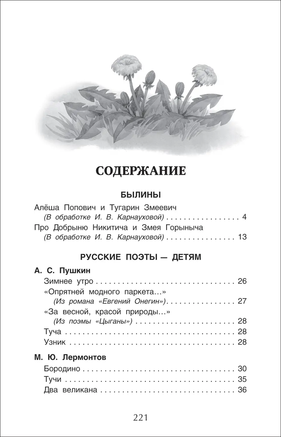 В хрестоматию вошли произведения устного народного творчества, стихотворения русских поэтов, рассказы, повести и сказки русских и зарубежных писателей. Сборник состоит из разделов «Былины», «Русские поэты – детям», «Русские писатели – детям», «Зарубежные писатели – детям». В книгу вошли произведения А. Пушкина, М. Лермонтова, Ф. Тютчева, А. Фета, И. Бунина, С. Есенина, Н. Гоголя, И. Тургенева, А. Чехова, К. Паустовского, Х.-К. Андерсена, О. Уайльда и других. Сборник составлен в соответствии с рекомендациями по внеклассному чтению в пятом классе. Тексты произведений печатаются без сокращений. Цветные иллюстрации.