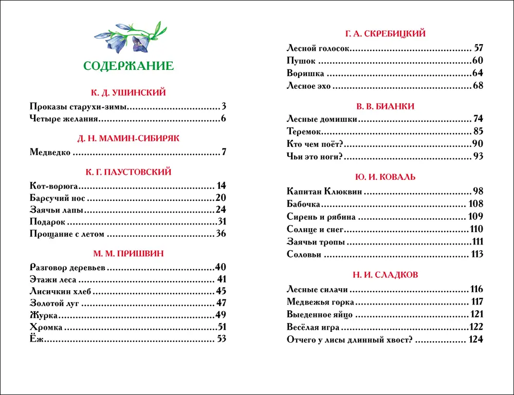 В книгу вошли произведения: К. Ушинского «Проказы старухи зимы», «Четыре желания», Д. Мамина-Сибиряка «Медведко», К. Паустовского «Кот Ворюга», «Барсучий нос», «Заячьи лапы», «Подарок», «Прощание с летом», М. Пришвина «Разговор деревьев», «Этажи леса», «Лисичкин хлеб», «Золотой луг», «Журка», «Хромка», «Еж», Г. Скребицкого «Лесной голосок», «Пушок», «Воришка», «Лесное эхо», В. Бианки «Лесные домишки», «Теремок», «Кто чем поет?», «Чьи это ноги?», Ю. Коваля «Капитан Клюквин», «Бабочка», «Сирень и рябина», «Солнце и снег», «Заячьи тропы», «Соловьи», Н. Сладкова «Лесные силачи», «Медвежья горка», «Выеденное яйцо», «Веселая игра