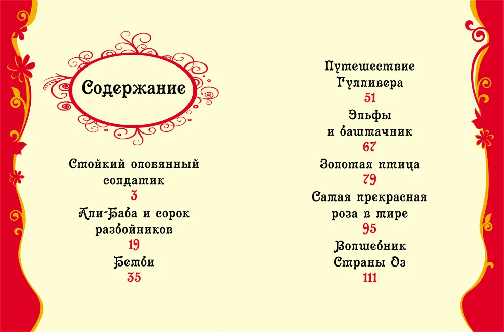 В сборник вошли известные, а также редкие и не менее интересные сказки: «Али-Баба и сорок разбойников», «Бемби», «Путешествие Гулливера», «Эльфы и башмачник», «Золотая птица», «Самая прекрасная роза в мире», «История ветра», «Волшебник страны ОЗ» и«Стойкий оловянный солдатик». Яркие иллюстрации на каждой странице. Крупный шрифт. Тексты сказок адаптированы для детей от 3 до 5 лет.