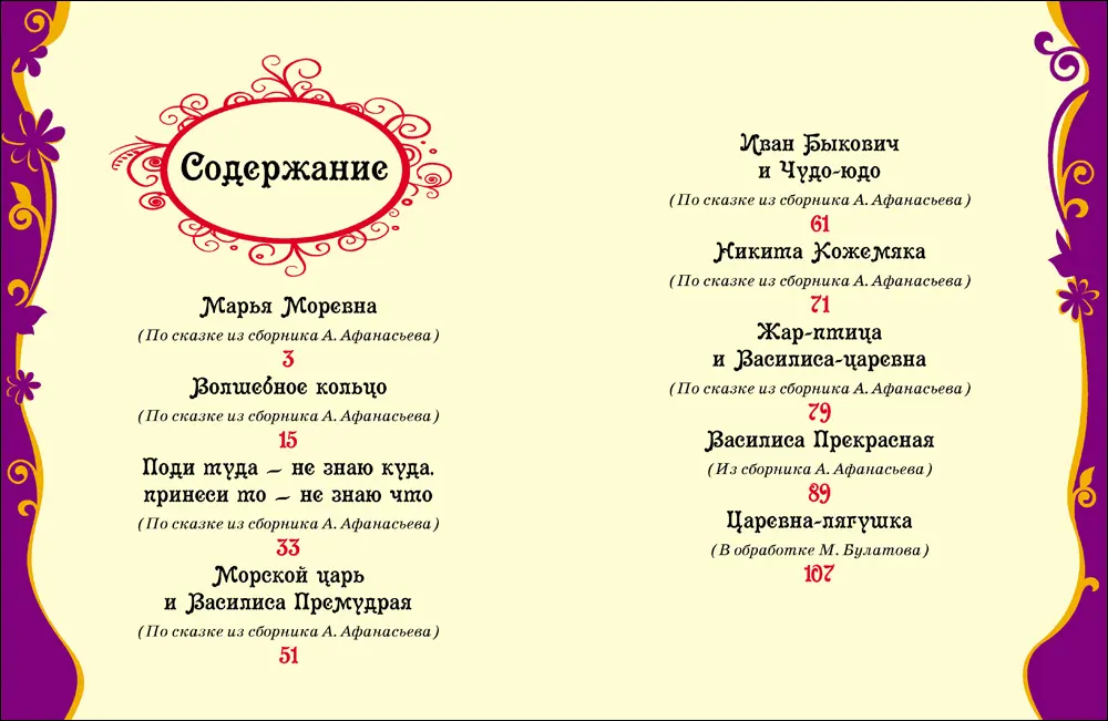 В книгу вошли самые известные русские волшебные сказки: «Марья Моревна», «Волшебное кольцо», «Поди туда – не знаю куда, принеси то – не знаю что», «Морской царь и Василиса Премудрая», «Иван Быкович и Чудо-юдо», «Никита Кожемяка», «Жар-птица и Василиса-царевна», «Царевна-лягушка». Яркие иллюстрации на каждой странице. Крупный шрифт. Тексты сказок адаптированы для детей от 3 до 5 лет.