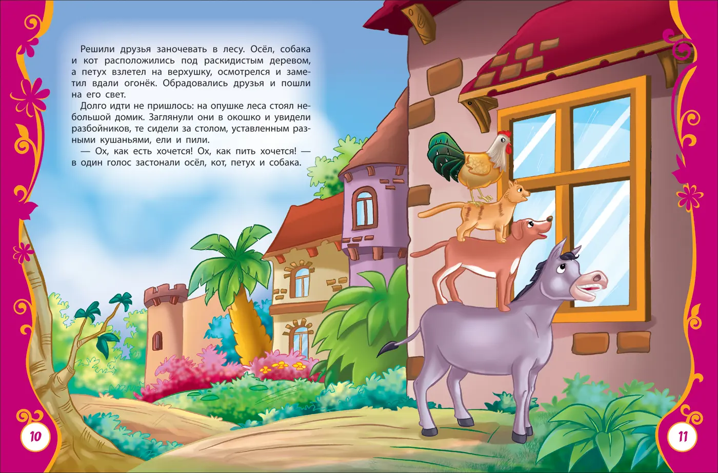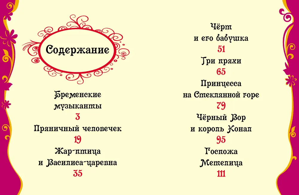 В сборник вошли известные, а также редкие и не менее интересные сказки: «Бременские музыканты», «Пряничный человек», «Жар-птица и Василиса-царевна», «Черт и его бабушка», «Три пряхи», «Принцесса на стеклянной горе», «Черный Вор и король Конал», «Господин Корбс» и «Госпожа Метелица». Яркие иллюстрации на каждой странице. Крупный шрифт. Тексты сказок адаптированы для детей от 3 до 5 лет.