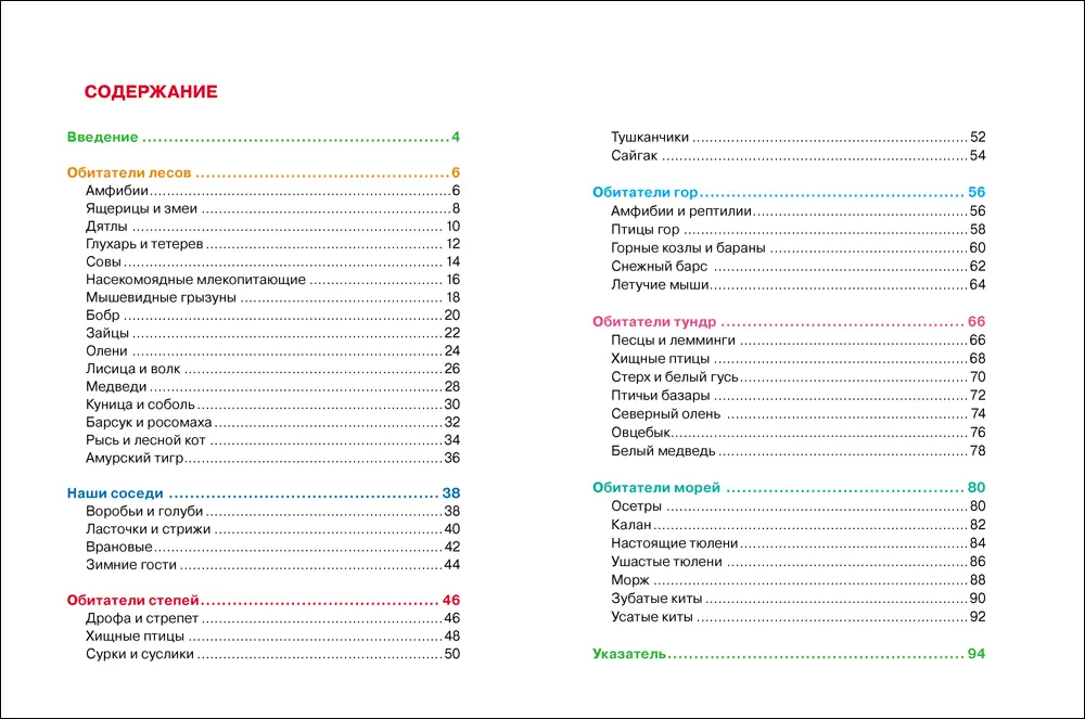Эта книга знакомит юных читателей с удивительным миром животных нашей Родины. Она поможет совершить увлекательную прогулку по разным уголкам нашей необъятой страны и познакомиться с обитателями лесов, степей и гор, вод морей и океанов, холодной Арктики. Читатель откроет для себя все секреты их жизни.