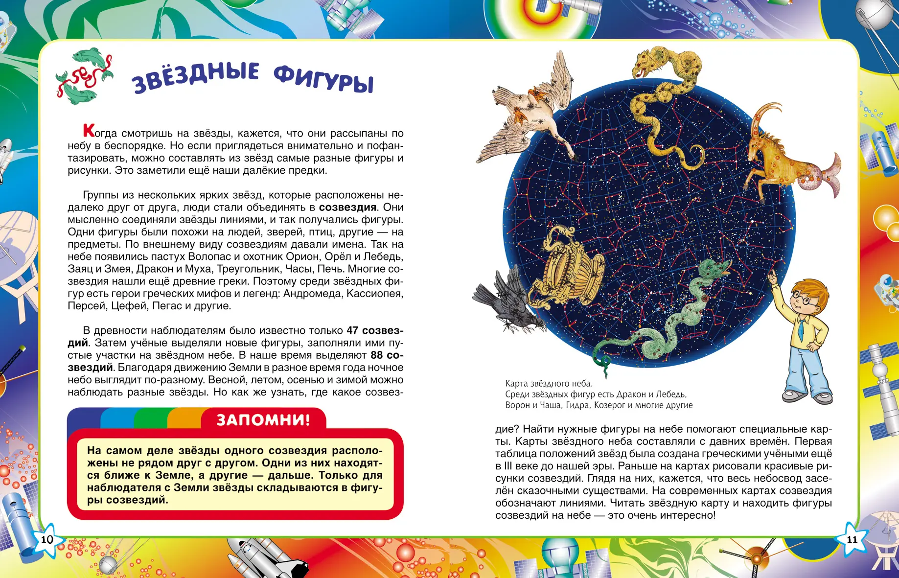 Книга в увлекательной и наглядной форме знакомит ребенка с окружающим миром. Он узнает о тайнах звездного неба, живой природы и человеческого тела, происхождении и особенностях планеты Земля, географическом положении, истории, обычаях и достопримечательностях различных стран мира, особенно России, а также познакомится со всевозможной техникой.