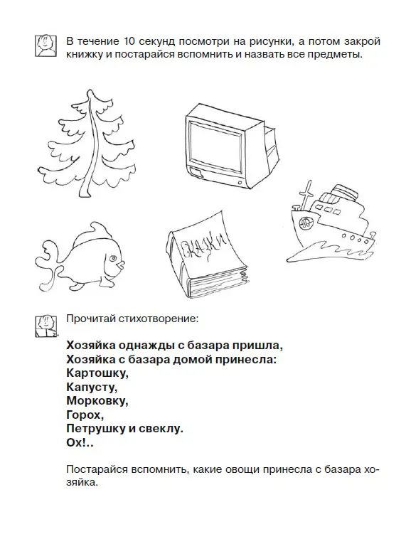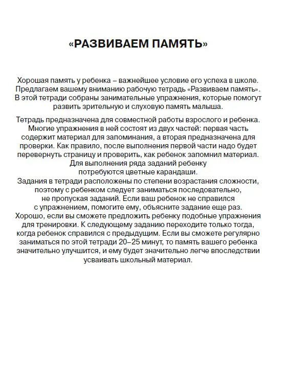 В рабочей тетради собраны занимательные упражнения, которые помогут развить зрительную и слуховую память малыша. Книгу можно использовать как на групповых занятиях в детских садах и в начальной школе, так и для индивидуальной работы с детьми.
