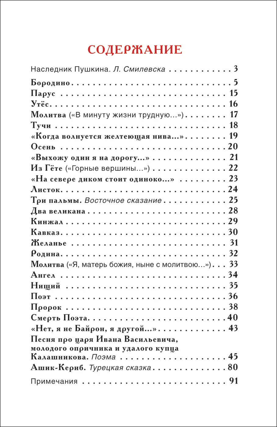 В книгу вошли следующие произведения М. Лермонтова: «Бородино», «Парус», «Утёс», «Молитва» («В минуту жизни трудную»), «Тучи», «Когда волнуется желтеющая нива», «Осень», «Выхожу один я на дорогу», «Из Гёте» («Горные вершины»), «На севере диком стоит одиноко», «Листок», «Три пальмы. Восточное сказание», «Два великана», «Кинжал», «Кавказ», «Желанье», «Родина», «Молитва» («Я, матерь божия, ныне с молитвою»), «Ангел», «Нищий», «Поэт», «Пророк», «Смерть Поэта», «Нет, я не Байрон, я другой», «Песня про царя Ивана Васильевича, молодого опричника и удалого купца Калашникова. Поэма», «Ашик-Кериб. Турецкая сказка».