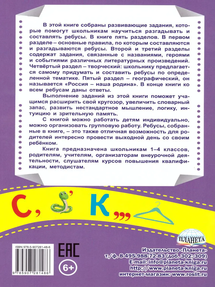 В этой книге собраны развивающие задания, которые помогут школьникам научиться разгадывать и составлять ребусы. В книге четыре раздела. В первом разделе – основные правила, по которым составляются и разгадываются ребусы. Второй и третий разделы содержат задания, связанные с названиями, героями и событиями различных литературных произведений. Четвёртый раздел – творческий: школьнику предлагается самому придумать и составить ребусы по определенной тематике.