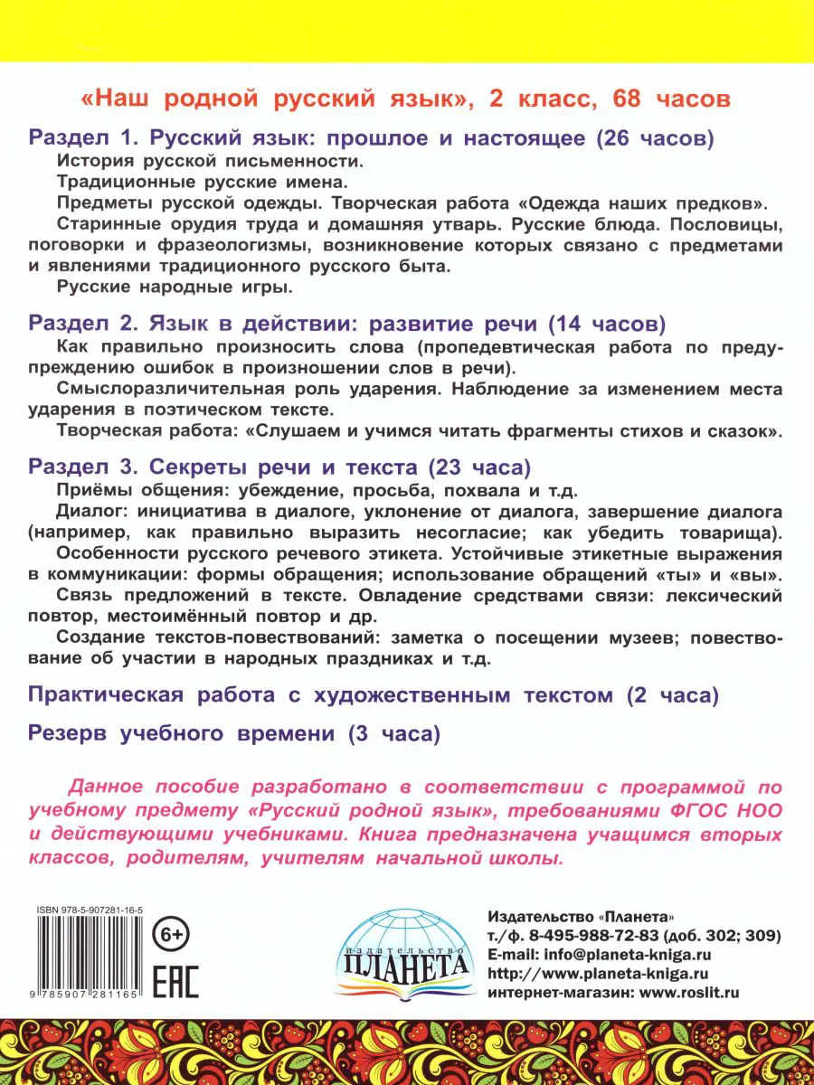 Данное пособие дополняет практическими заданиями существующие учебные пособия по предмету «Русский родной язык» и рассчитано на весь учебный год. В книге три раздела, каждый из которых оформлен в определённой цветовой гамме: