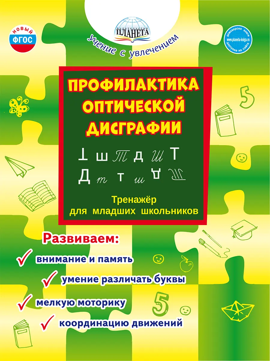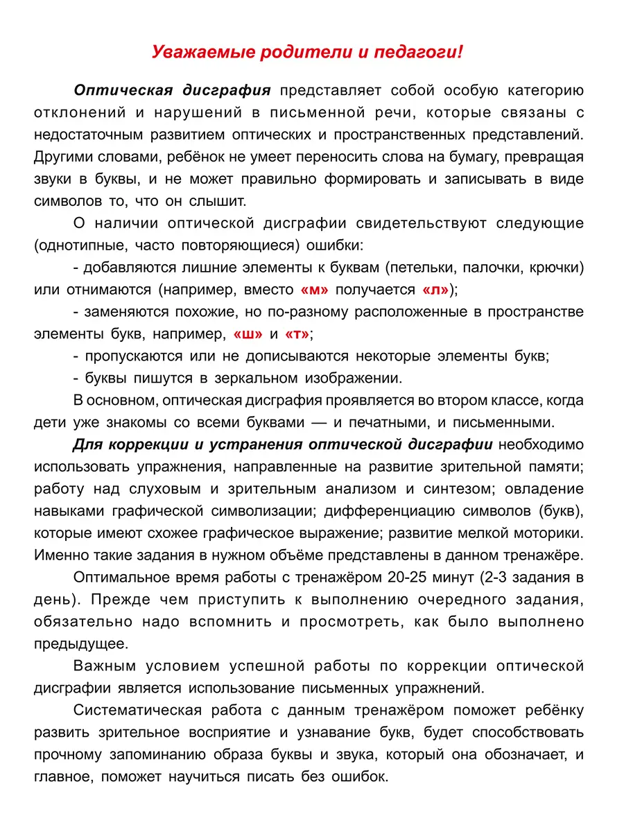 Для коррекции и устранения оптической дисграфии необходимо использовать упражнения, направленные на развитие зрительного внимания, дифференциации оптических образов букв, которые дети, как правило, путают. Именно такие задания в нужном объёме представлены в данном тренажёре.