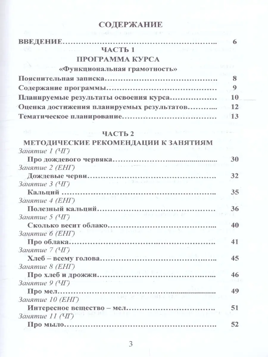 Логика курса выстроена следующим образом: блоки «Читательская грамотность» и «Естественно-научная грамотность» – это занятия 1-16; блоки «Математическая грамотность» и «Финансовая грамотность» – занятия 18-33. В программе даны также две проверочные работы. Авторы курса предлагают эффективные способы как коллективной, так и индивидуальной работы, позволяющие учителю успешно формировать функциональную грамотность обучающихся.