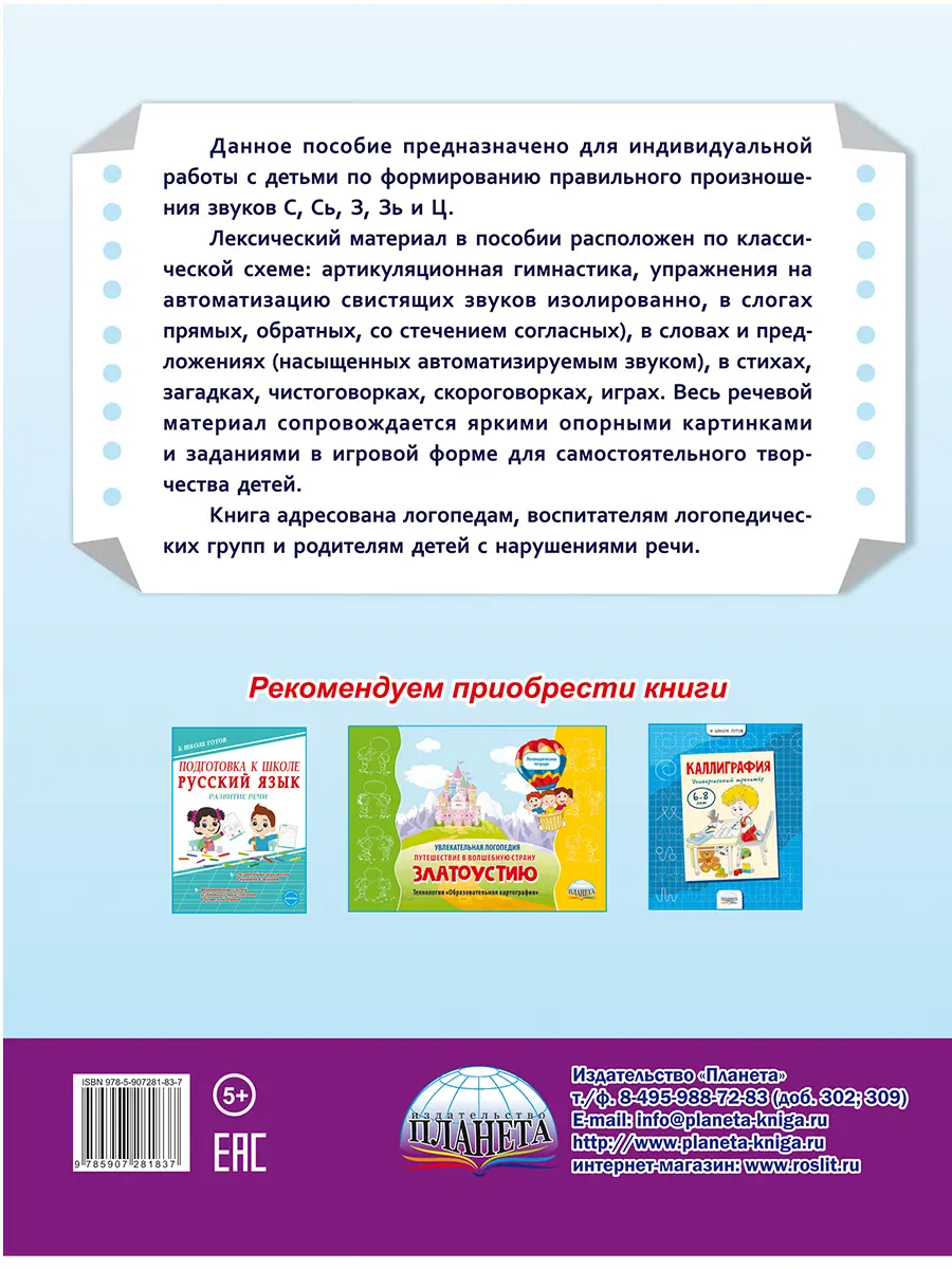 Данное пособие предназначено для индивидуальной работы с детьми по формированию правильного произношения звуков С, Сь, З, Зь и Ц.