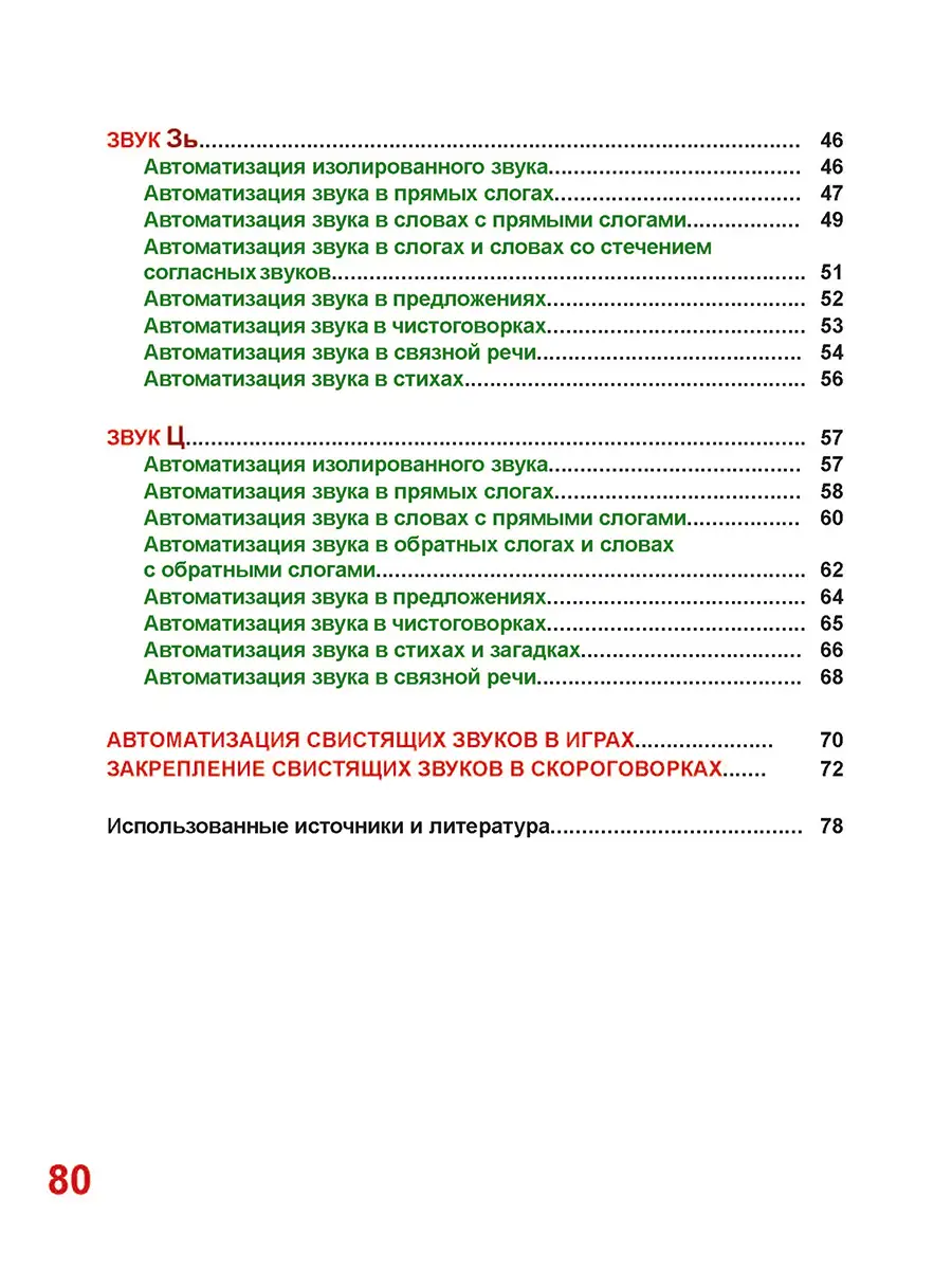 Лексический материал в пособии расположен по классической схеме: артикуляционная гимнастика, упражнения на автоматизацию свистящих звуков изолированно, в слогах (прямых, обратных, со стечением согласных), в словах и предложениях (насыщенных автоматизируемым звуком), в стихах, загадках, чистоговорках, скороговорках, играх.