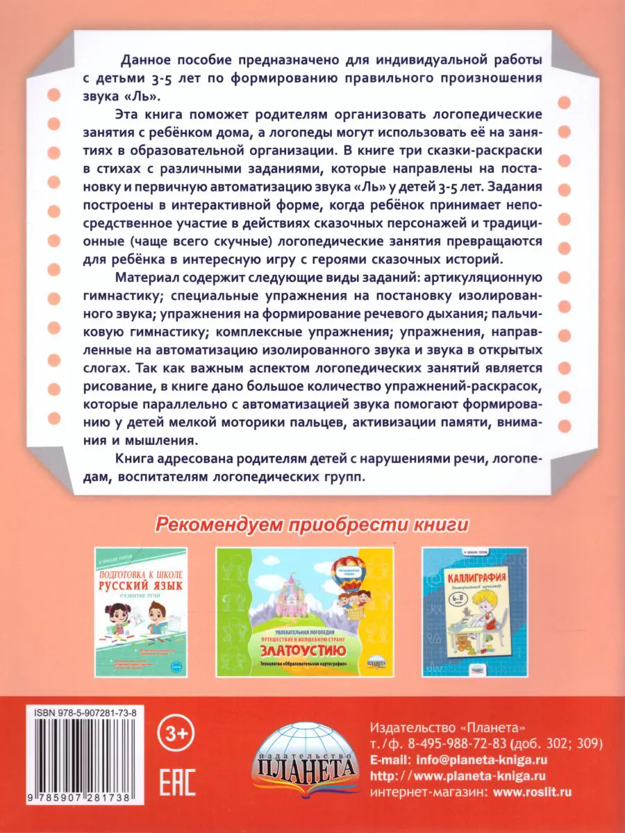 Эта книга поможет родителям организовать логопедические занятия с ребёнком дома, а логопеды могут использовать её на занятиях в образовательной организации. В книге три сказки-раскраски в стихах с различными заданиями, которые направлены на постановку и первичную автоматизацию звука «Ль» у детей 3-5 лет. Задания построены в интерактивной форме, когда ребёнок принимает непосредственное участие в действиях сказочных персонажей и традиционные (чаще всего скучные) логопедические занятия превращаются для ребёнка в интересную игру с героями сказочных историй.