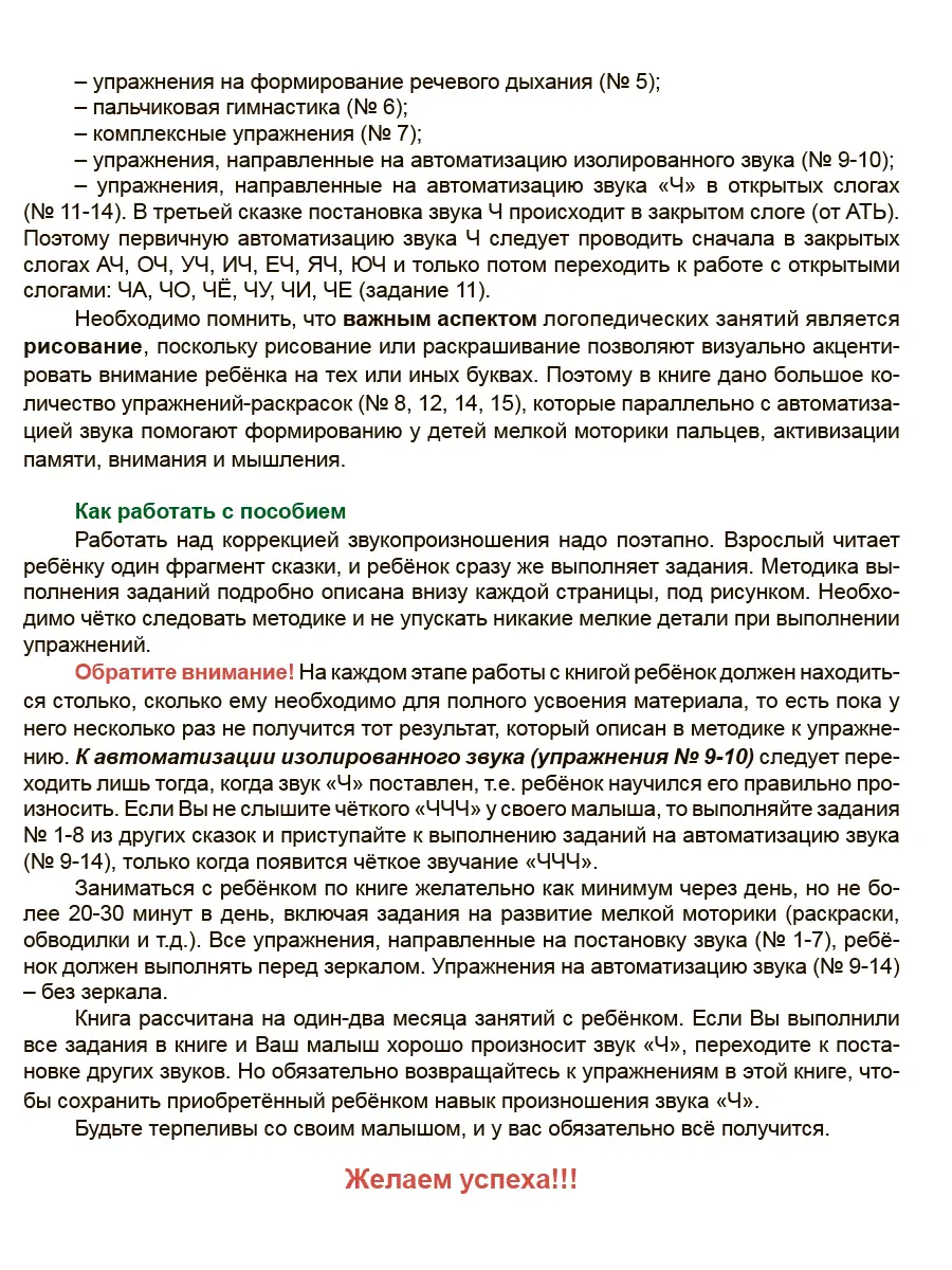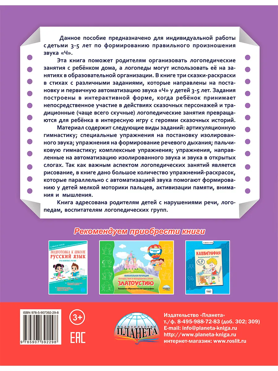 Эта книга поможет родителям организовать логопедические занятия с ребёнком дома, а логопеды могут использовать её на занятиях в образовательной организации. В книге три сказки-раскраски в стихах с различными заданиями, которые направлены на постановку и первичную автоматизацию звука «Ч» у детей 3-5 лет. Задания построены в интерактивной форме, когда ребёнок принимает непосредственное участие в действиях сказочных персонажей и традиционные (чаще всего скучные) логопедические занятия превращаются для ребёнка в интересную игру с героями сказочных историй.