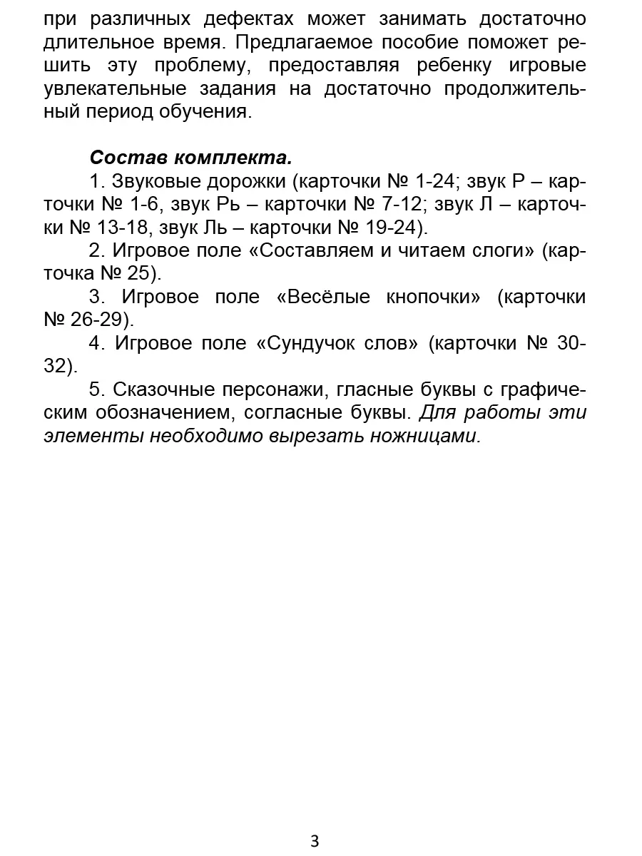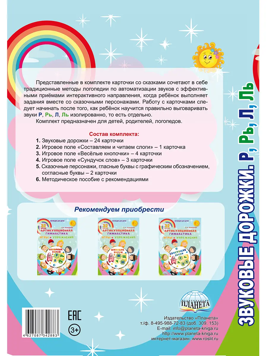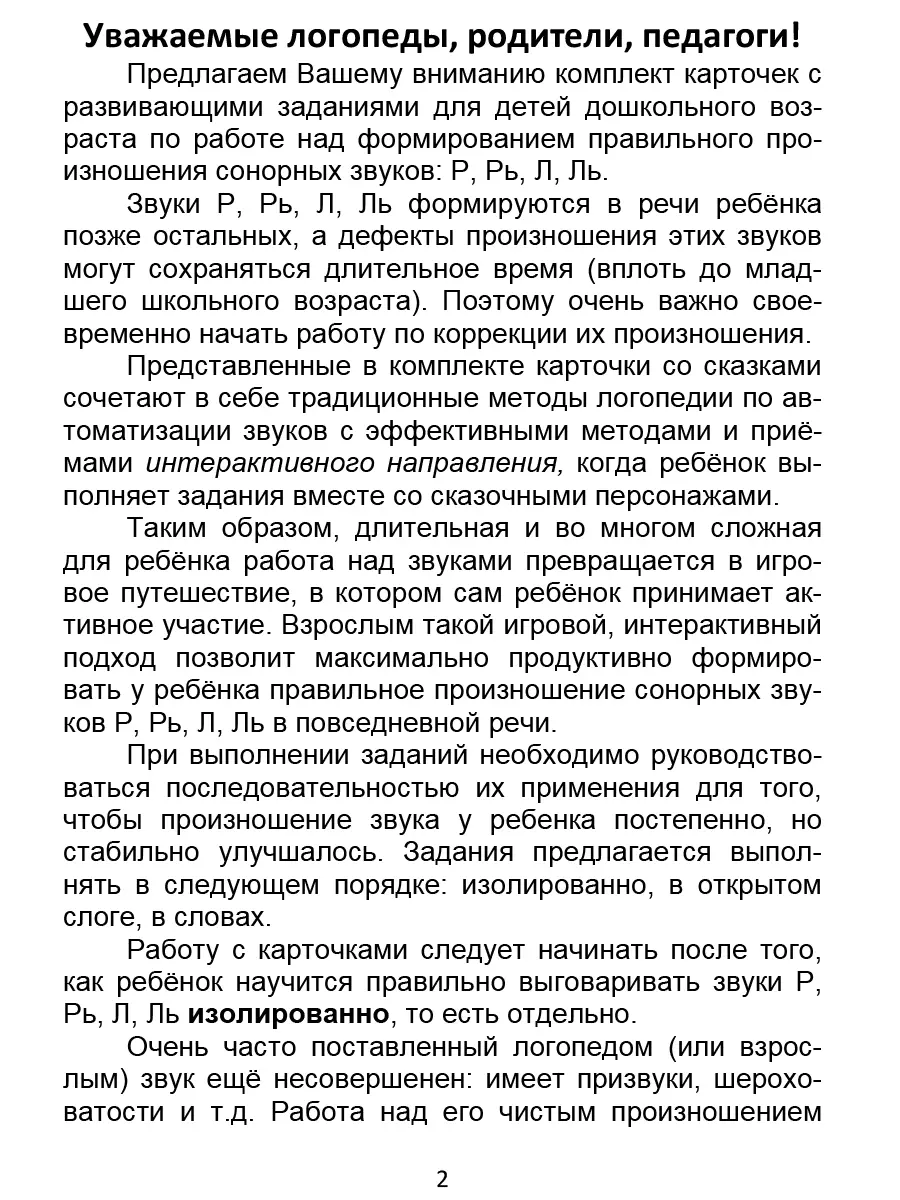 Представленные в комплекте карточки со сказками сочетают в себе традиционные методы логопедии по автоматизации звуков с эффективными приёмами интерактивного направления, когда ребёнок выполняет задания вместе со сказочными персонажами. Работу с карточками следует начинать после того, как ребёнок научится правильно выговаривать звуки Р, Рь, Л, Ль изолированно, то есть отдельно.