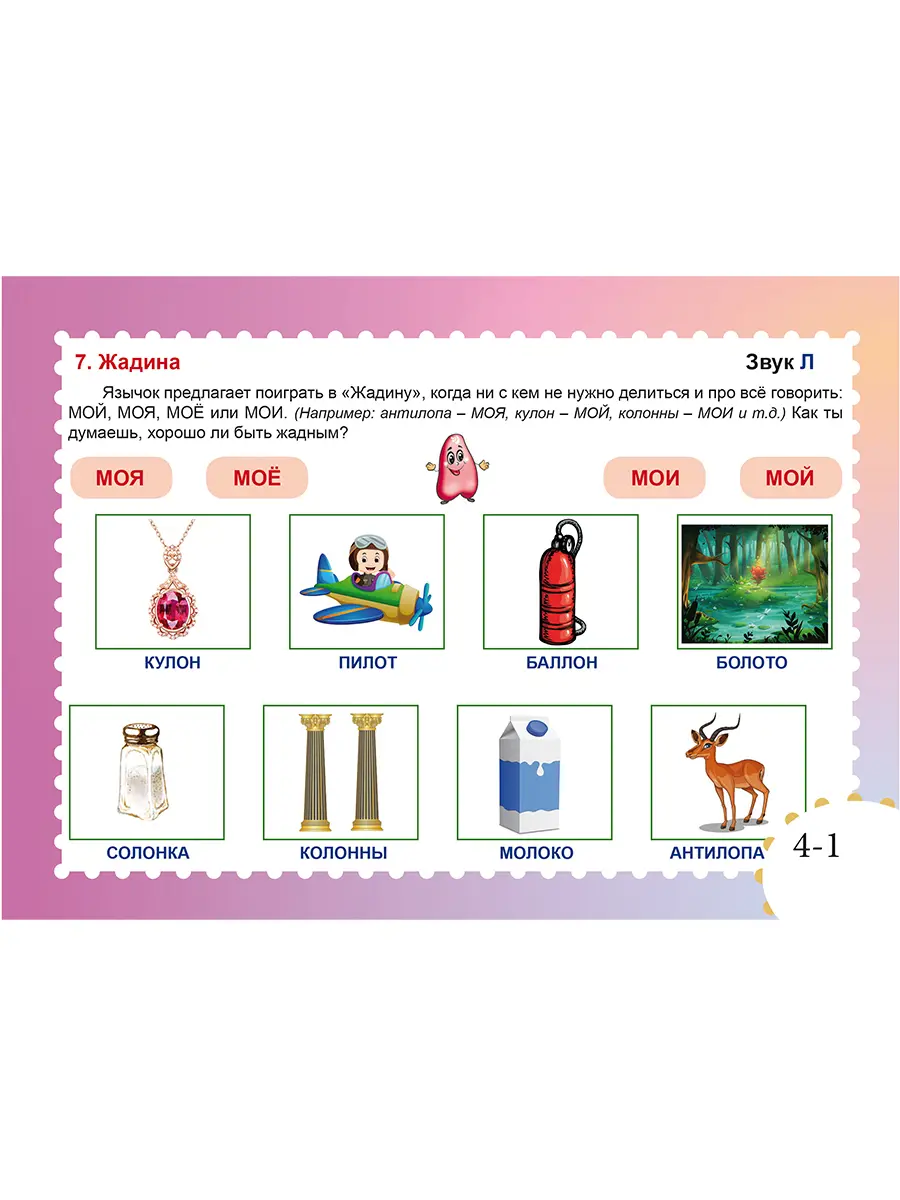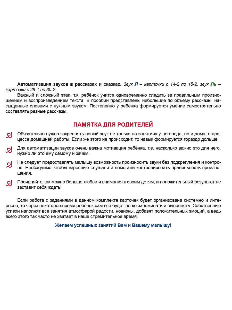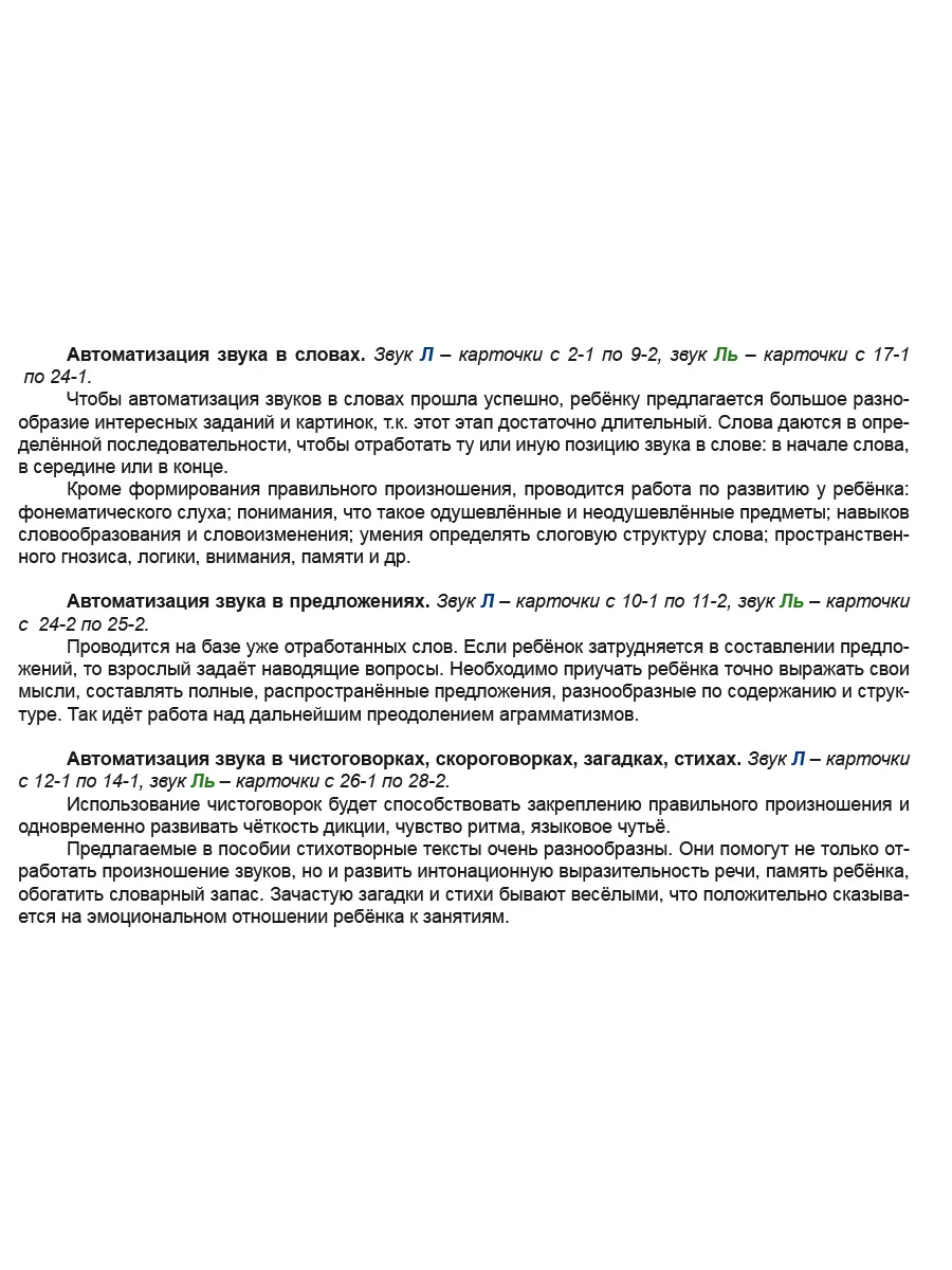 Комплект содержит 32 карточки с логопедическими играми (58 игр), систематичное применение которых позволит ускорить процесс автоматизации у детей сонорных звуков Л и Ль и будет способствовать развитию у детей слухоречевого внимания и памяти, фонематического слуха, навыков словообразования и словоизменения.
