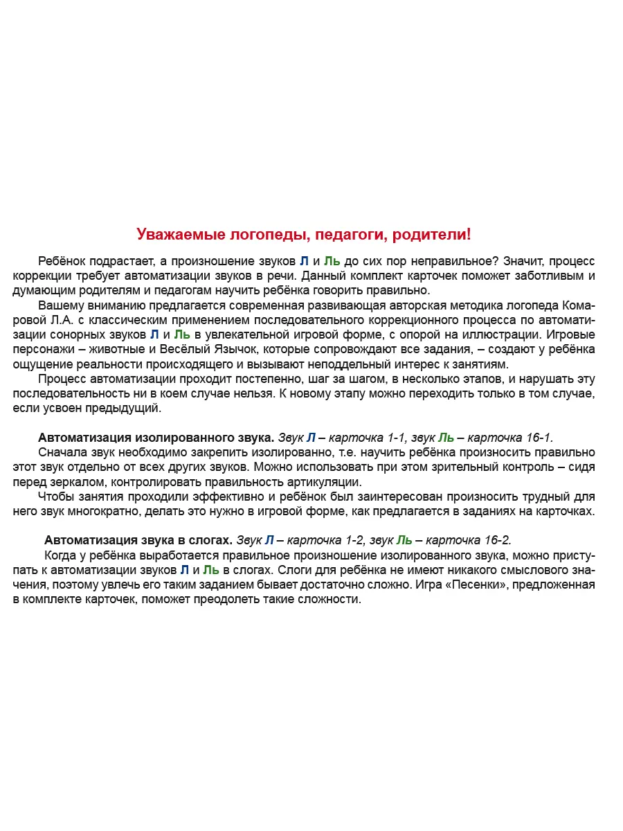 Представленные в комплекте карточки сочетают в себе традиционные методы логопедии и развивающую авторскую методику логопеда Комаровой Л.А. с классическим применением последовательного коррекционного процесса автоматизации сонорных звуков Л и Ль с опорой на иллюстрации.