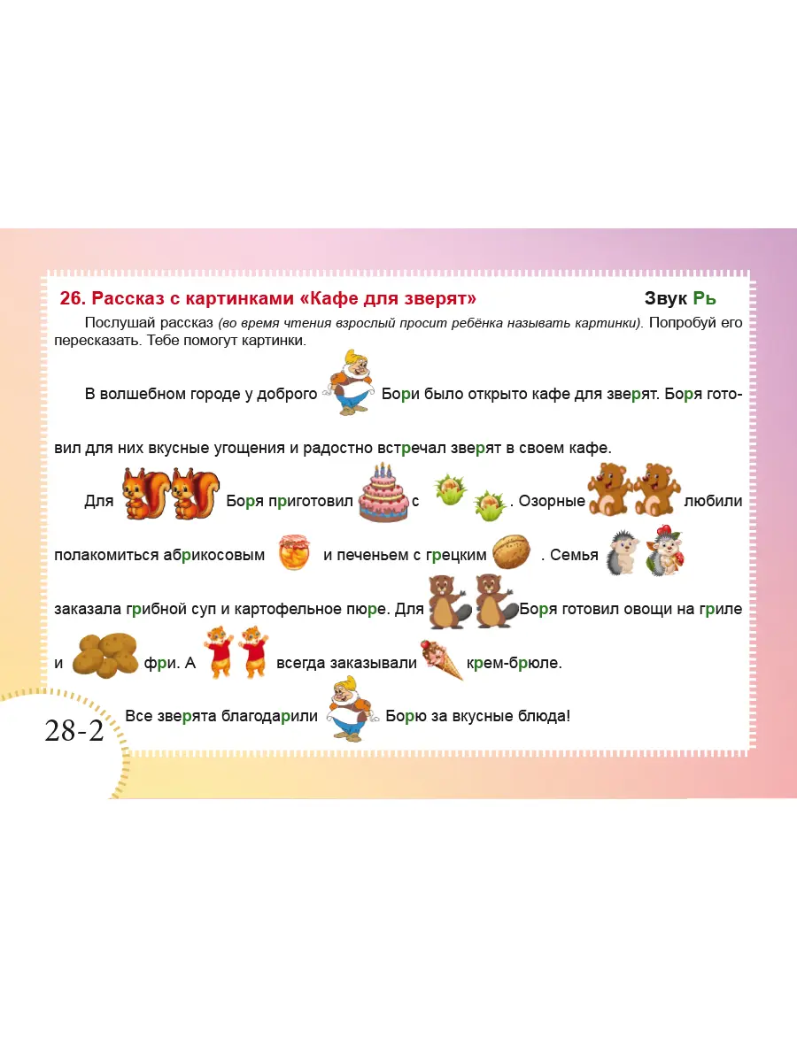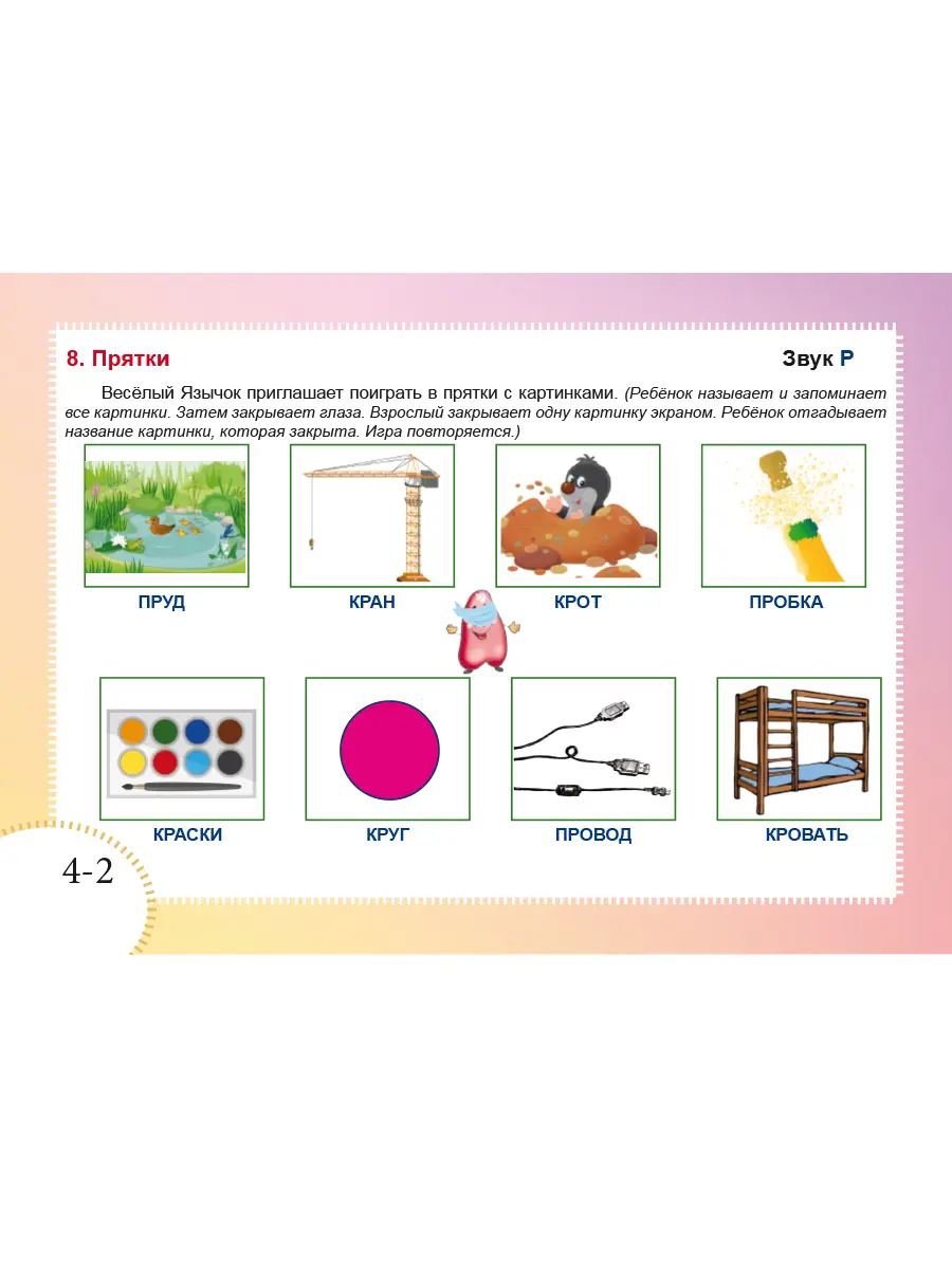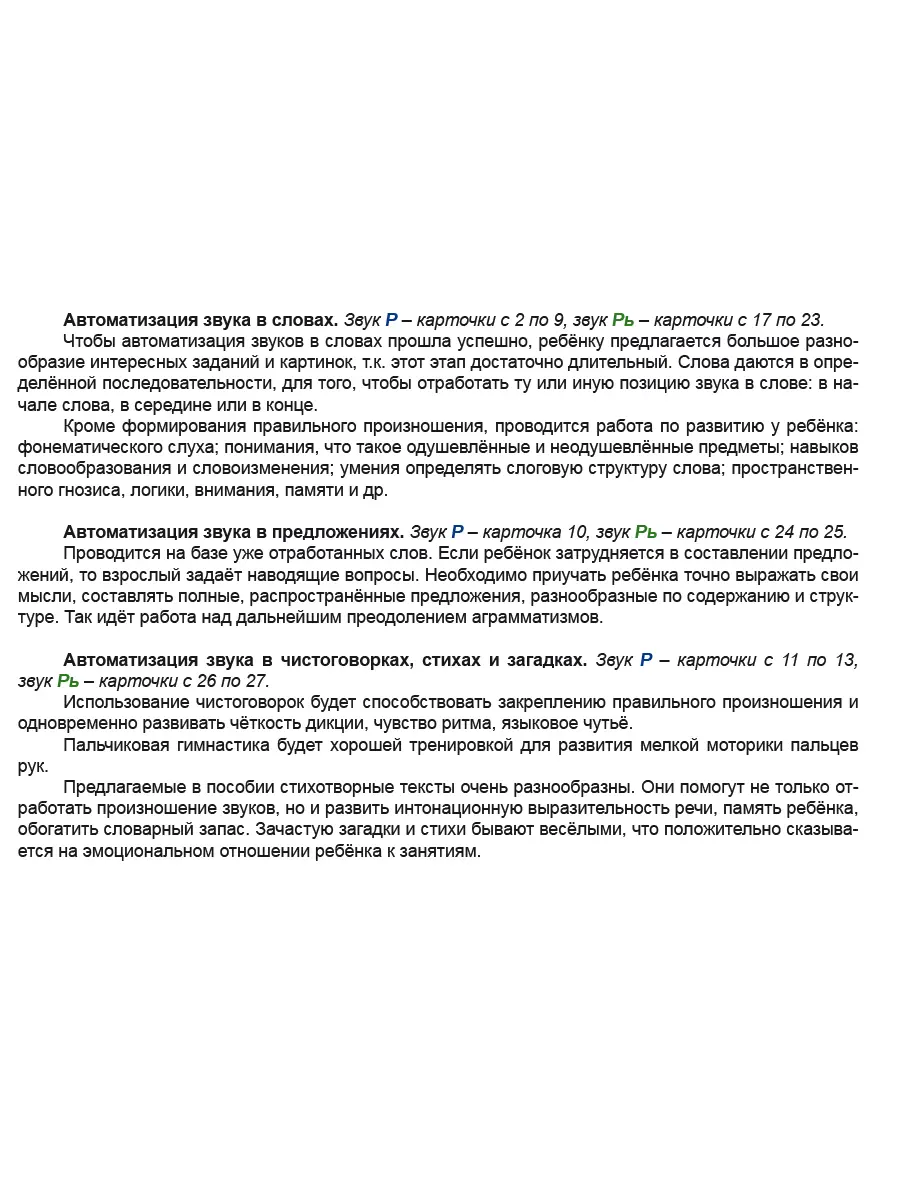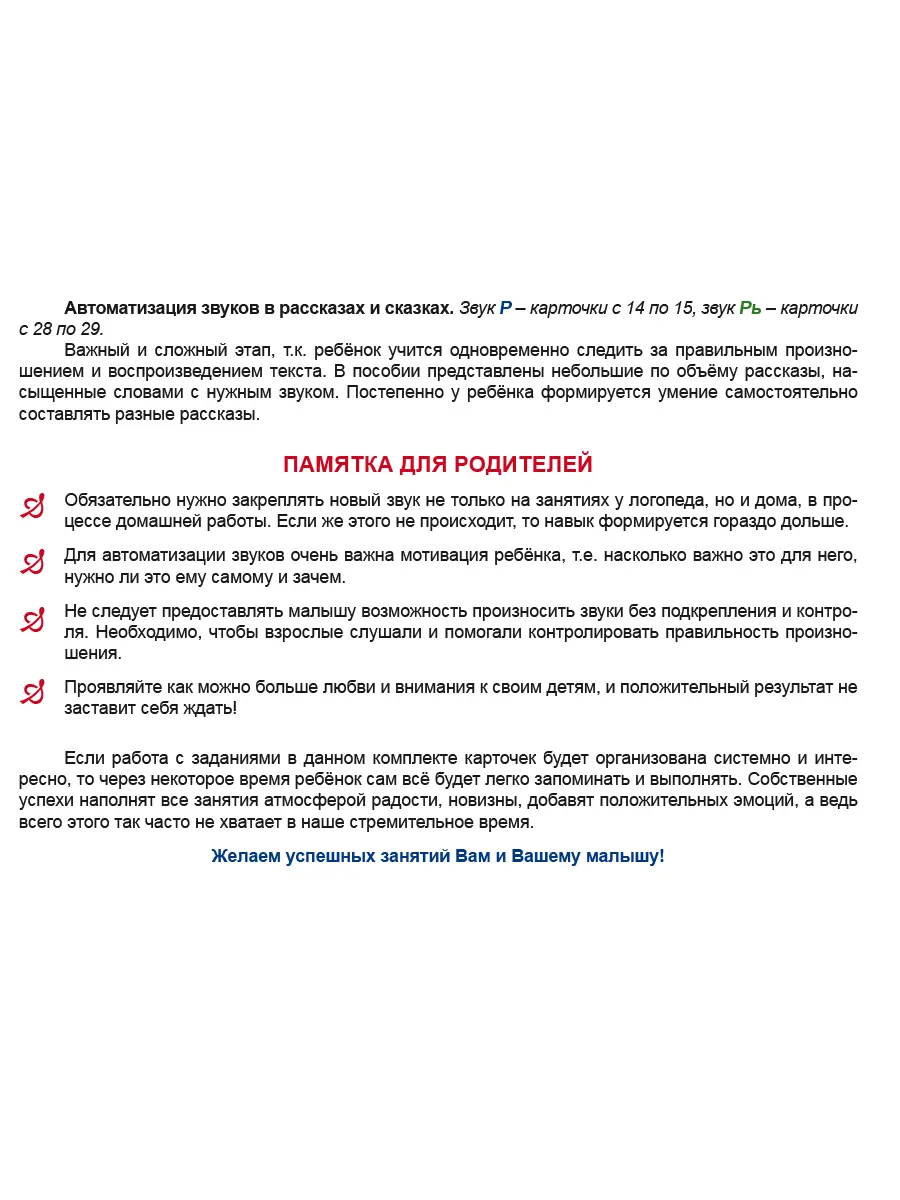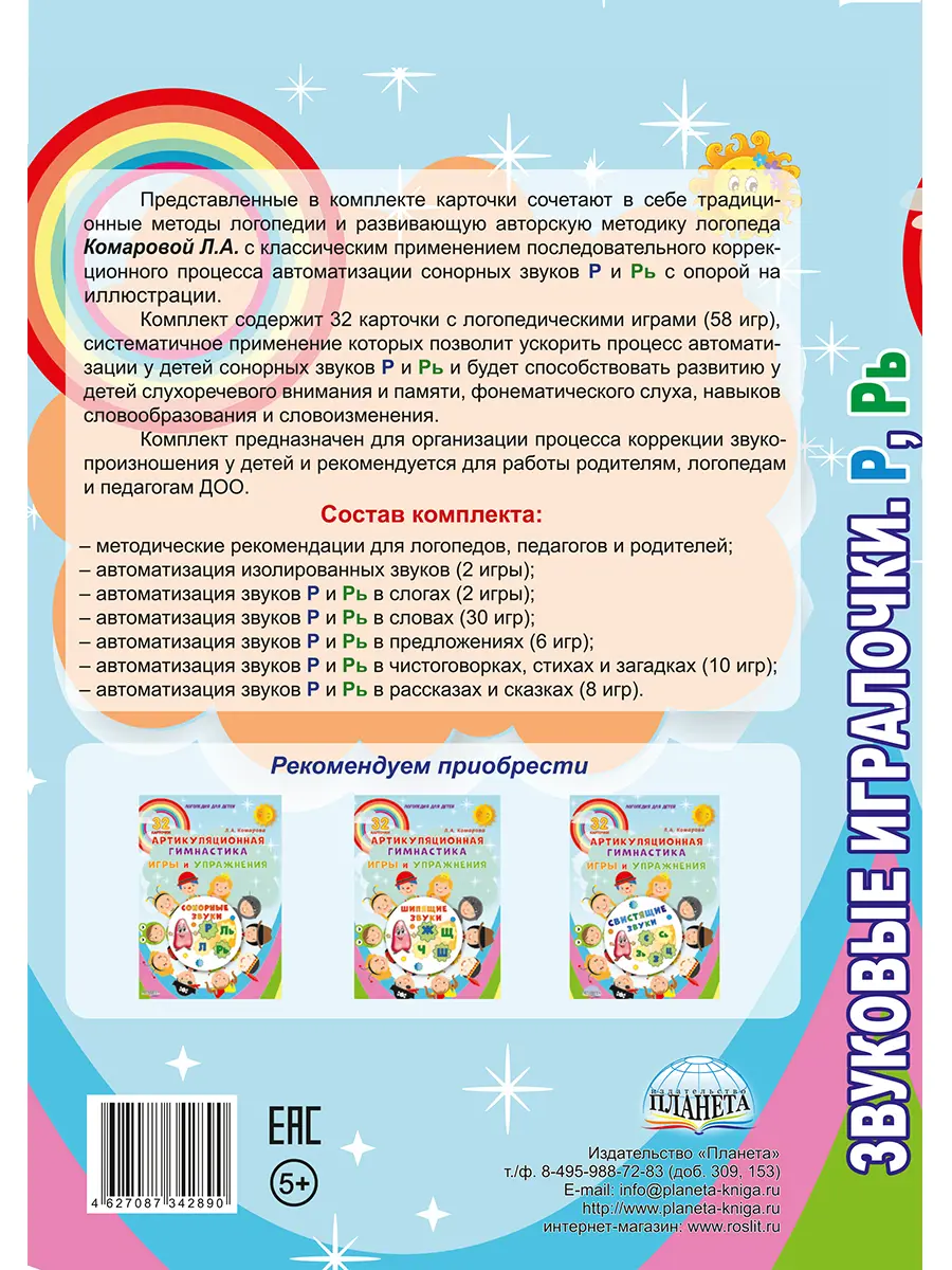 Комплект содержит 32 карточки с логопедическими играми (58 игр), систематичное применение которых позволит ускорить процесс автоматизации у детей сонорных звуков Р и Рь и будет способствовать развитию у детей слухоречевого внимания и памяти, фонематического слуха, навыков словообразования и словоизменения.