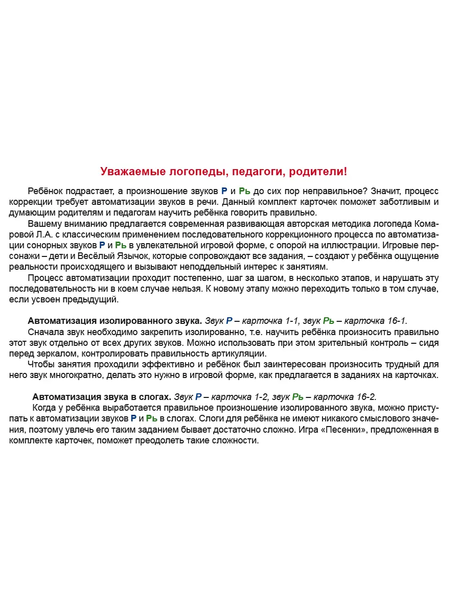 Представленные в комплекте карточки сочетают в себе традиционные методы логопедии и развивающую авторскую методику логопеда Комаровой Л.А. с классическим применением последовательного коррекционного процесса автоматизации сонорных звуков Р и Рь с опорой на иллюстрации.