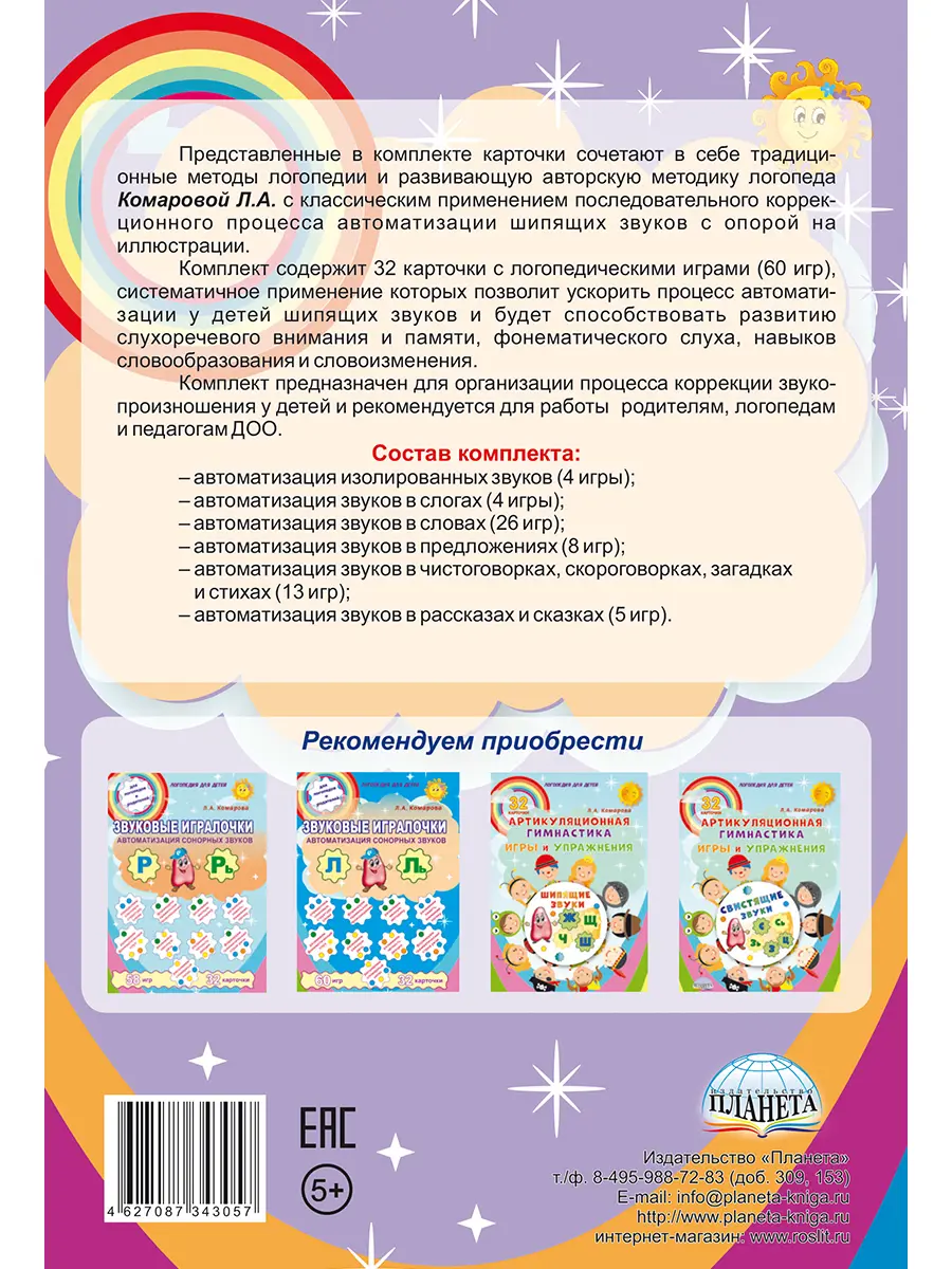 Комплект содержит 32 карточки с логопедическими играми (60 игр), систематичное применение которых позволит ускорить процесс автоматизации у детей шипящих звуков и будет способствовать развитию слухоречевого внимания и памяти, фонематического слуха, навыков словообразования и словоизменения.