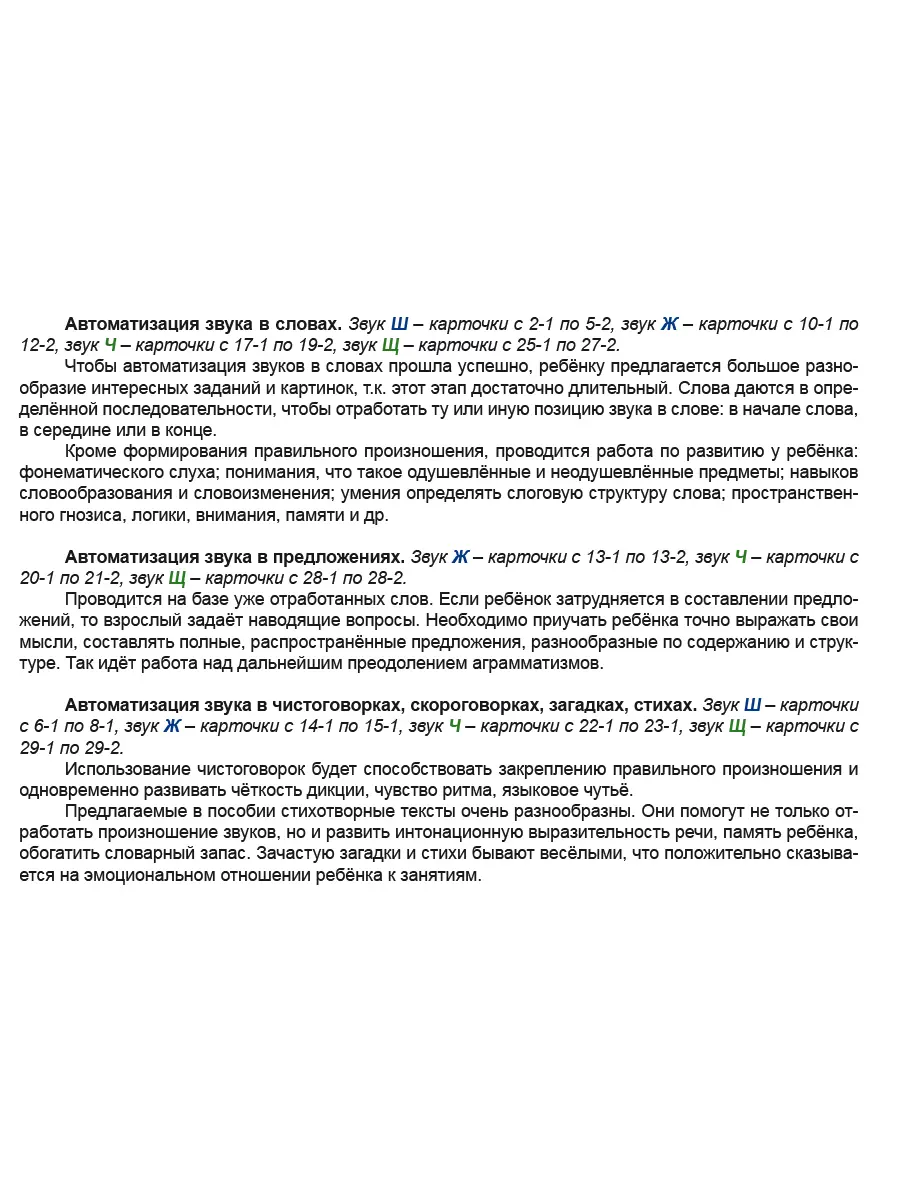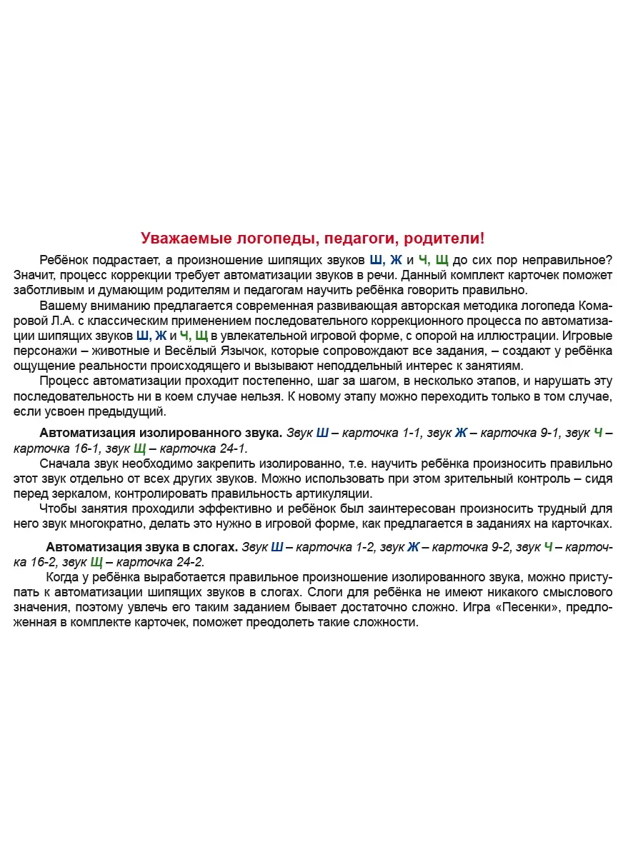 Представленные в комплекте карточки сочетают в себе традиционные методы логопедии и развивающую авторскую методику логопеда Комаровой Л.А. с классическим применением последовательного коррекционного процесса автоматизации шипящих звуков с опорой на иллюстрации.