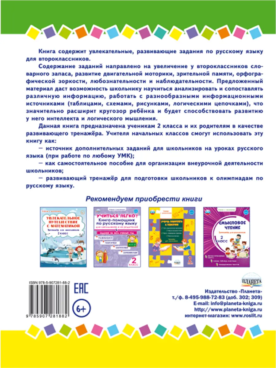 Книга содержит увлекательные, развивающие задания по русскому языку для второклассников.