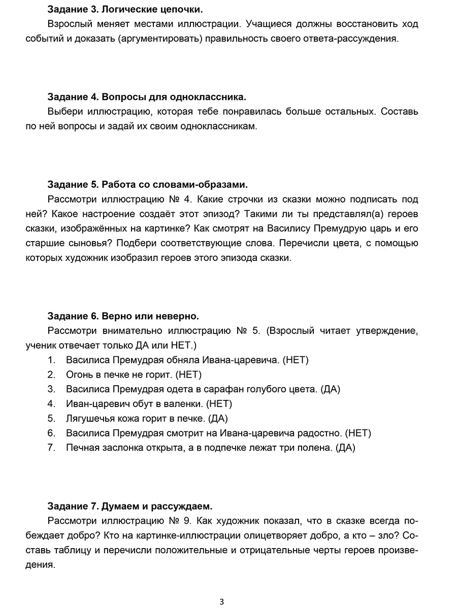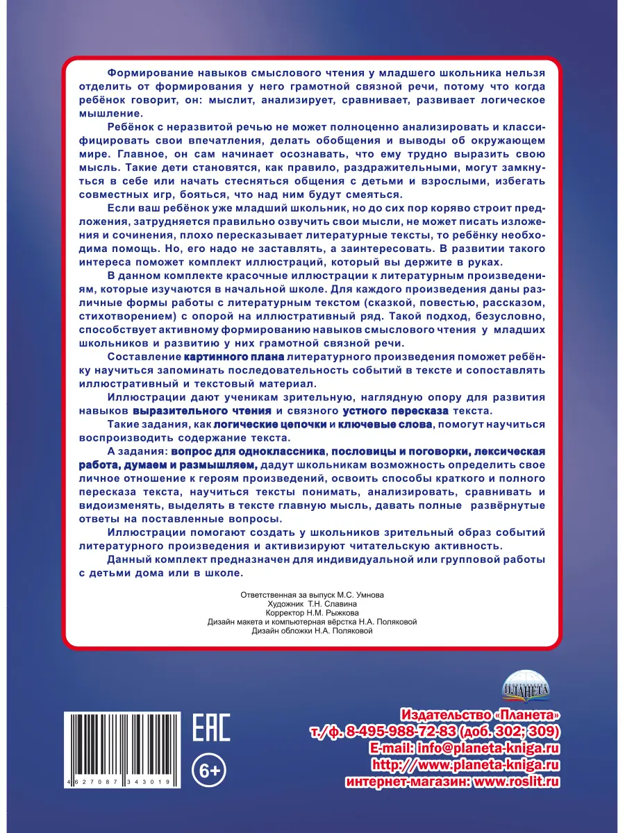 Для каждого произведения даны различные формы работы с литературным текстом (сказкой, повестью, рассказом, стихотворением) с опорой на иллюстративный ряд, что способствует активному формированию навыков смыслового чтения у младших школьников и развитию у них грамотной связной речи.