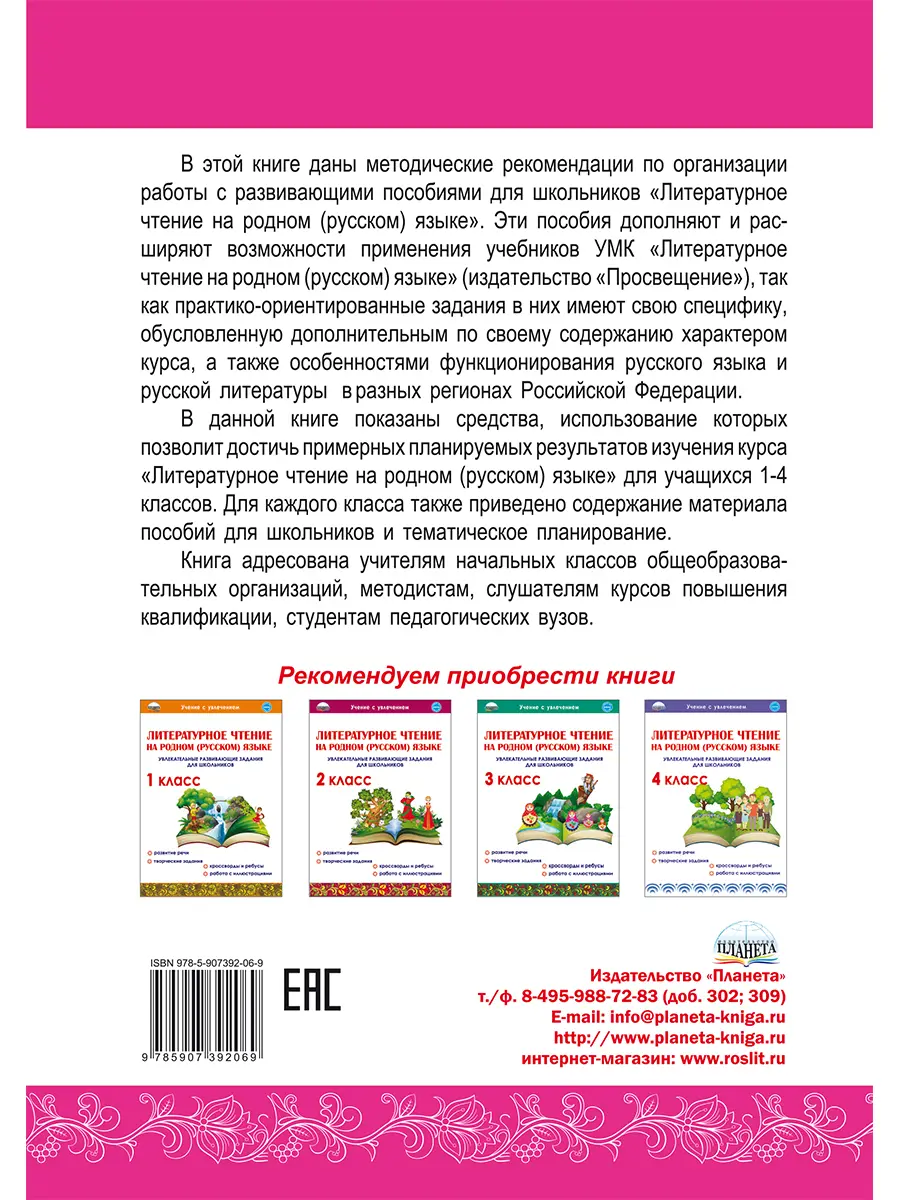 В этой книге даны методические рекомендации по организации работы с развивающими пособиями для школьников «Литературное чтение на родном (русском) языке». Эти пособия дополняют и расширяют возможности применения учебников УМК «Литературное чтение на родном (русском) языке» (издательство «Просвещение»), так как практико-ориентированные задания в них имеют свою специфику, обусловленную дополнительным по своему содержанию характером курса, а также особенностями функционирования русского языка и русской литературы в разных регионах Российской Федерации.