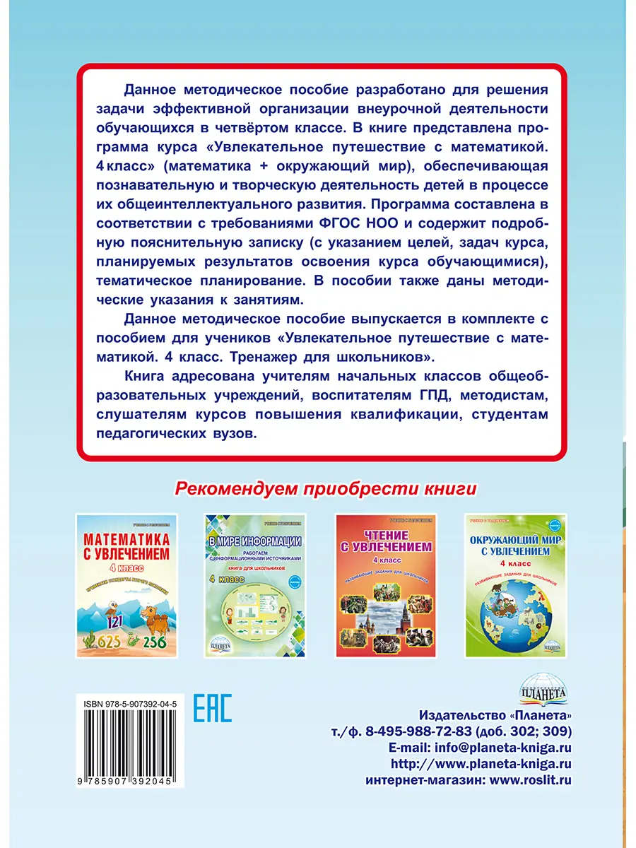 Данное методическое пособие выпускается в комплекте с пособием для учеников «Увлекательное путешествие с математикой 4 класс. Тренажер для школьников». Книга адресована учителям начальных классов общеобразовательных учреждений, воспитателям ГПД, методистам, слушателям курсов повышения квалификации, студентам педагогических вузов.