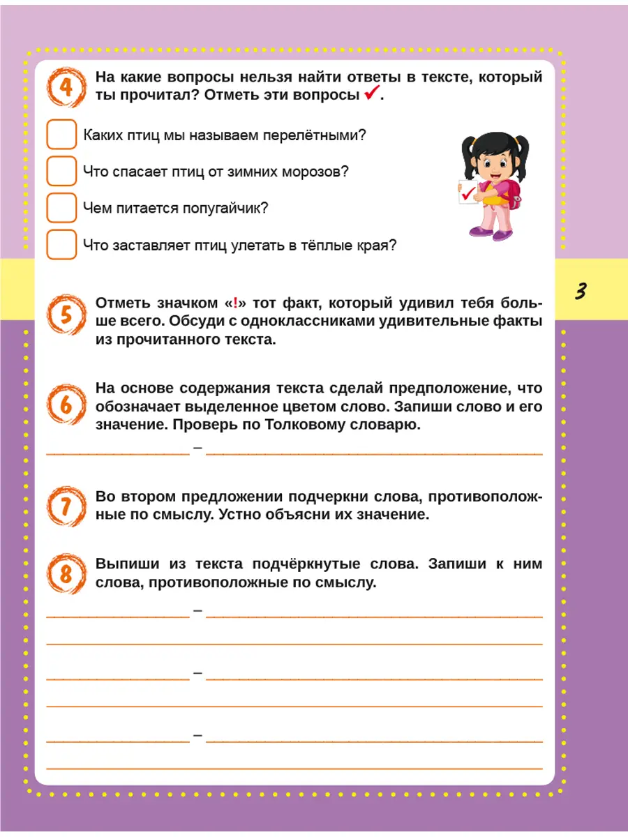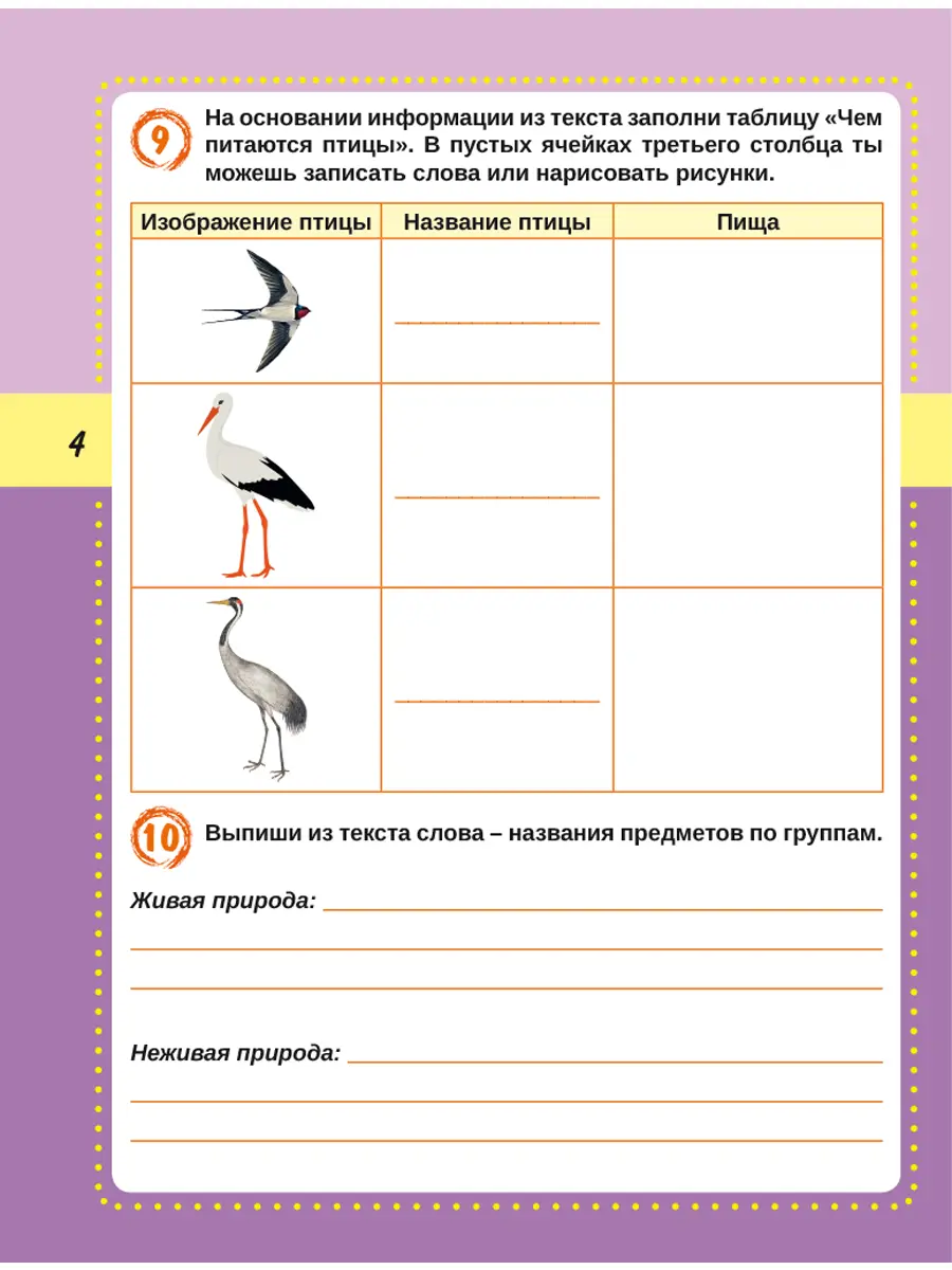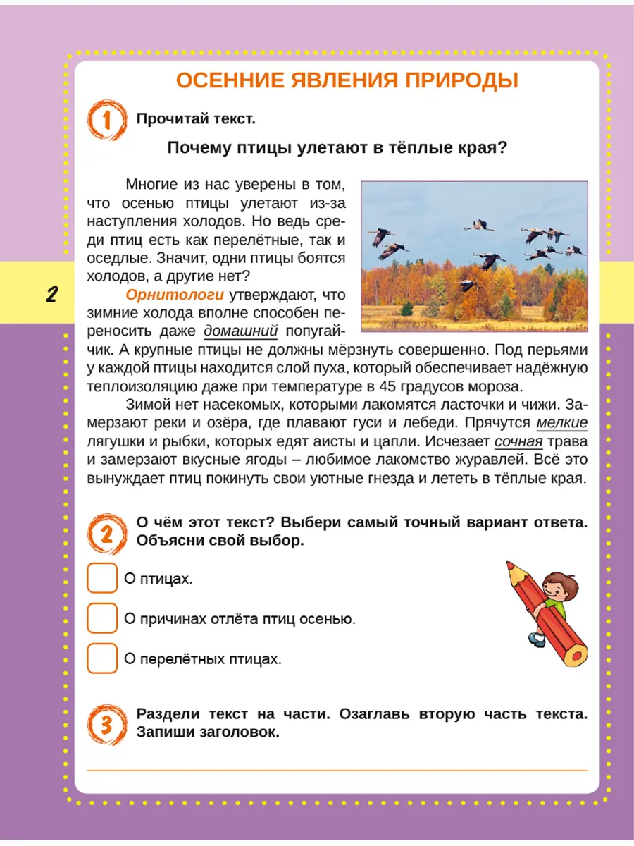 Основная цель тренажёра – научить второклассников осмысленной и результативной работе с научно-популярным текстом. Навыки такой работы проверяются у школьников в процессе написания Всероссийской проверочной работы по русскому языку (часть 2, задания 6-14). В процессе обучения смысловому чтению у младших школьников должны быть сформированы умения: понимать, анализировать, сравнивать и видоизменять текст, озаглавливать тексты, составлять план для краткого и подробного пересказа, выделять ключевые слова, преобразовывать текст в таблицу или кластер, генерировать данный текст, т.е. создавать текст под свои цели и задачи. В этой книге все задания направлены именно на формирование перечисленных умений и навыков.