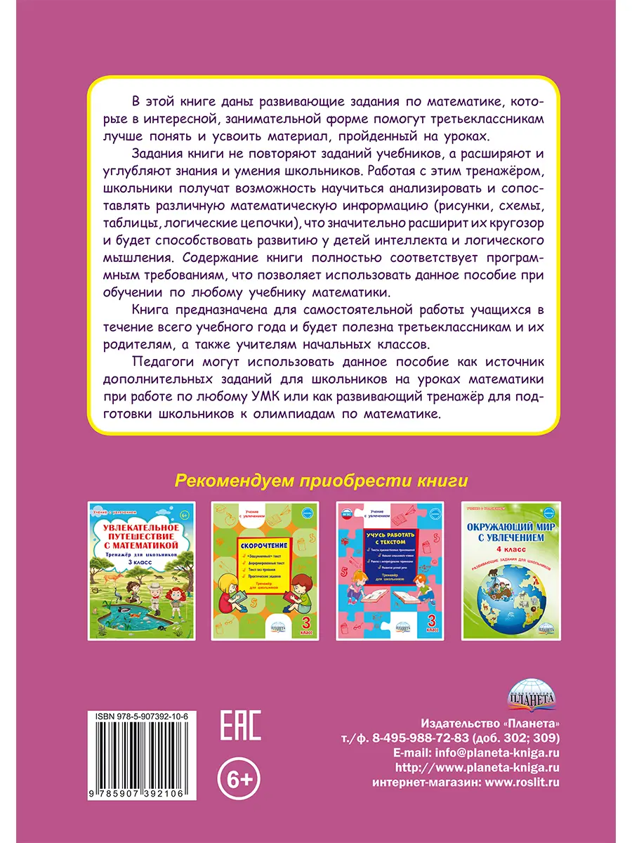 Задания книги не повторяют заданий учебников, а расширяют и углубляют знания и умения школьников. Работая с этим тренажёром, школьники получат возможность научиться анализировать и сопоставлять различную математическую информацию (рисунки, схемы, таблицы, логические цепочки), что значительно расширит их кругозор и будет способствовать развитию у детей интеллекта и логического мышления. Содержание книги полностью соответствует программным требованиям, что позволяет использовать данное пособие при обучении по любому учебнику математики.