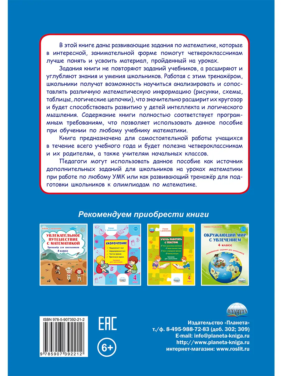 В этой книге даны развивающие задания по математике, которые в интересной, занимательной форме помогут четвероклассникам лучше понять и усвоить материал, пройденный на уроках. Задания книги не повторяют заданий учебников, а расширяют и углубляют знания и умения школьников.