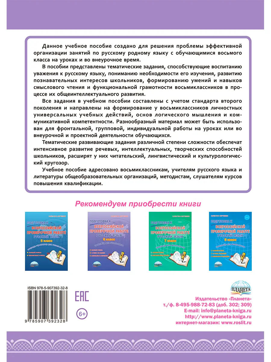 Данное учебное пособие создано для решения проблемы эффективной организации занятий по русскому родному языку с обучающимися восьмого класса на уроках и во внеурочное время.