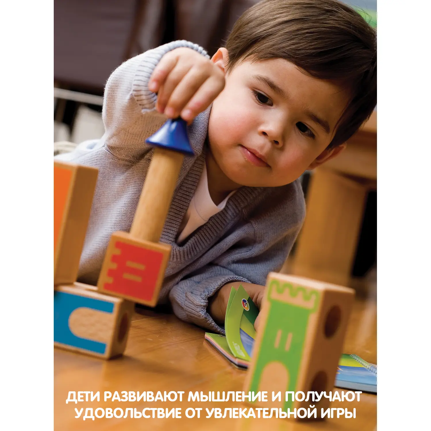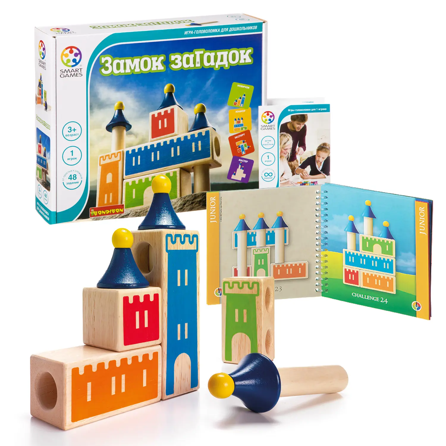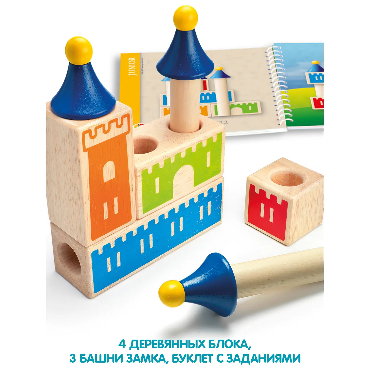 Постройте замок из деревянных деталей в соответствии с прилагаемыми заданиями, блок за блоком, башню за башней! Для этого придется задействовать ум и сообразительность, поскольку башни имеют разный диаметр, а блоки – разные отверстия, и правильный ответ может быть только один!