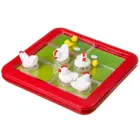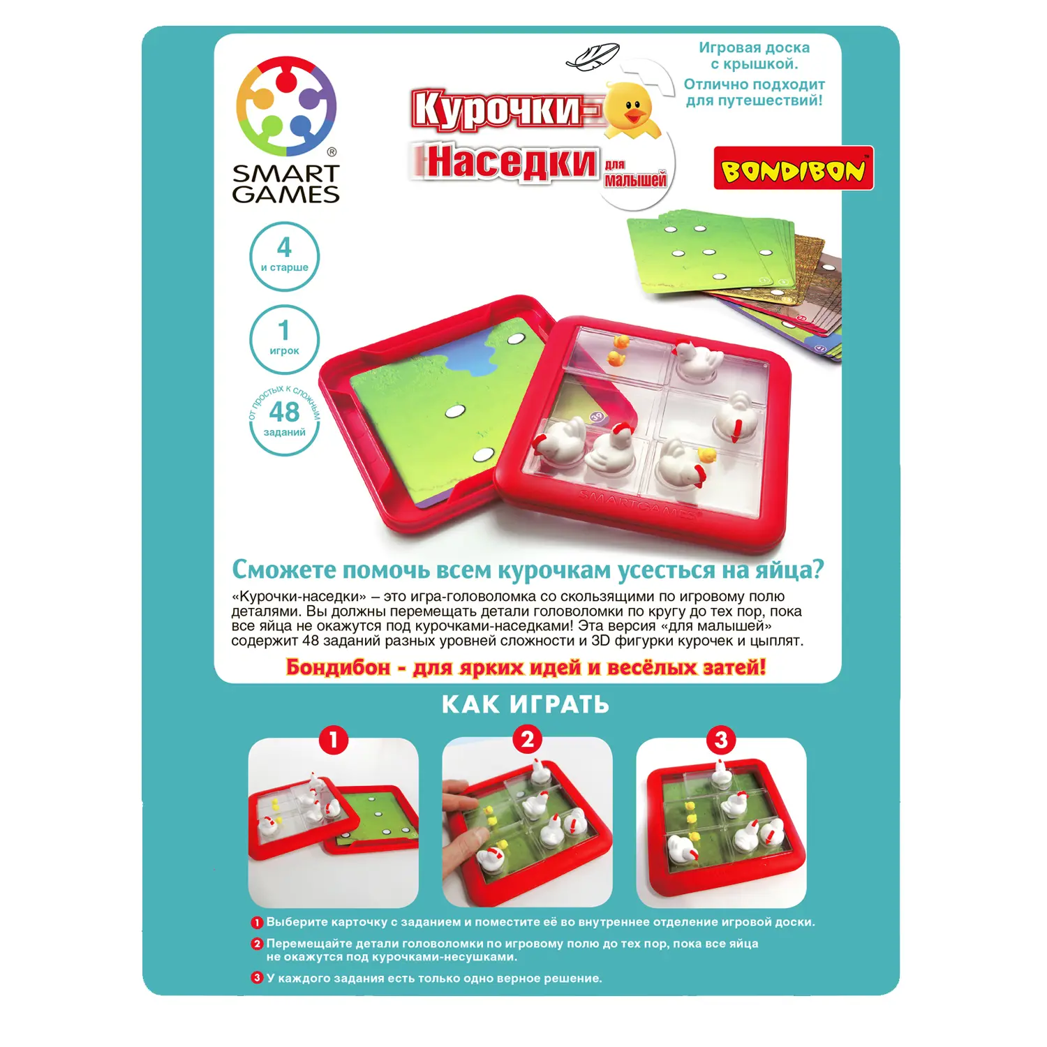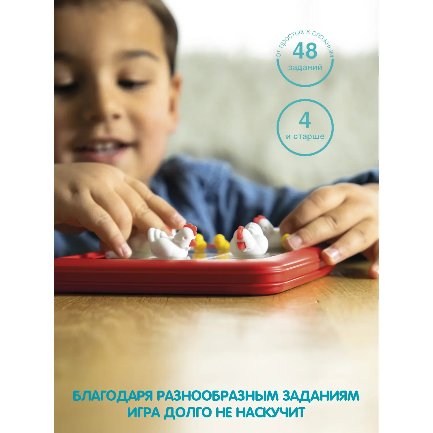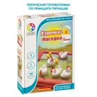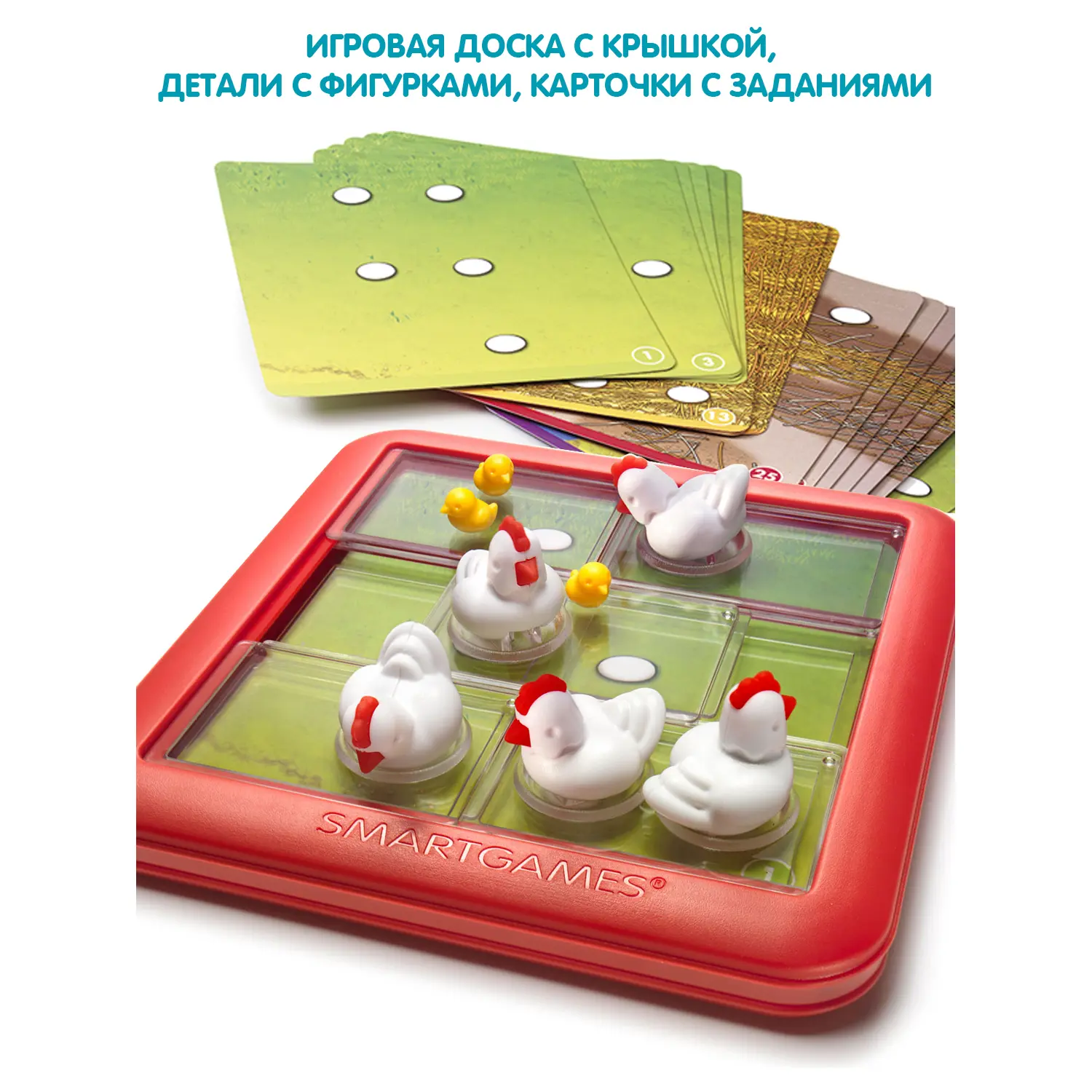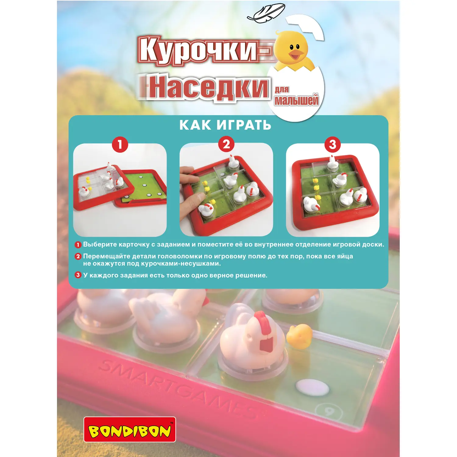 Игра содержит: игровое поле с отсеком для хранения 48 карточек с заданиями, 5 прозрачных деталей головоломки с курочками и цыплятами, листовка с решениями.