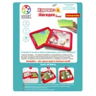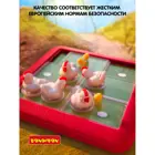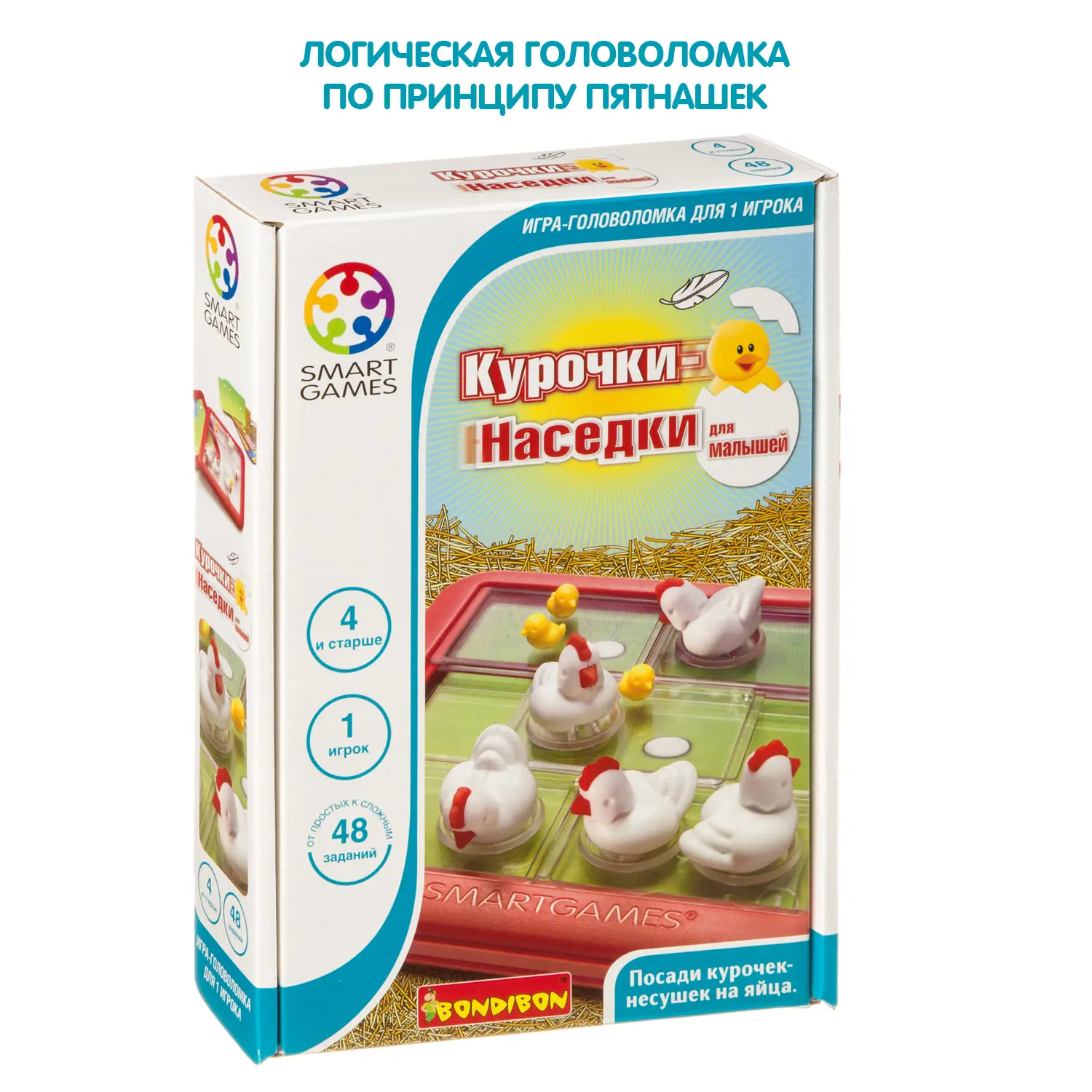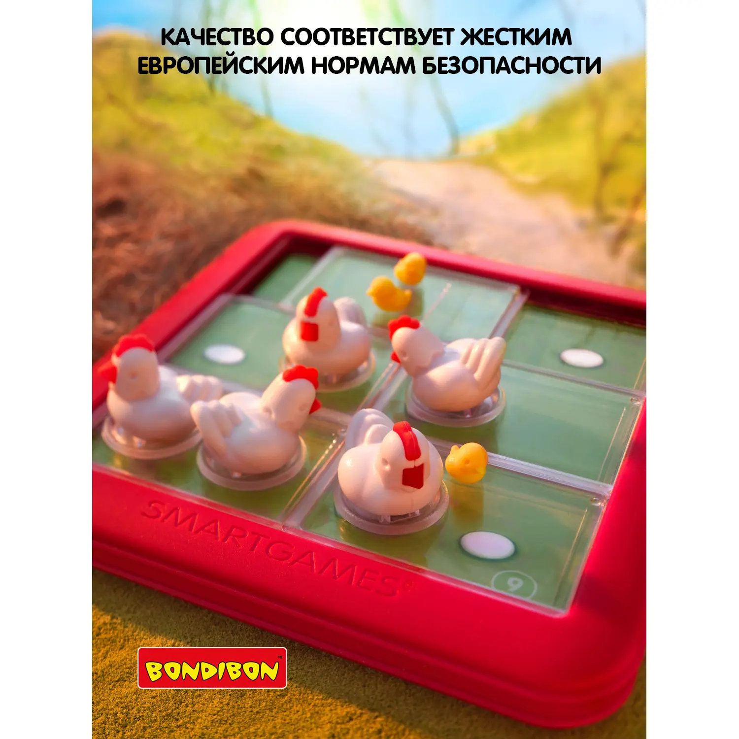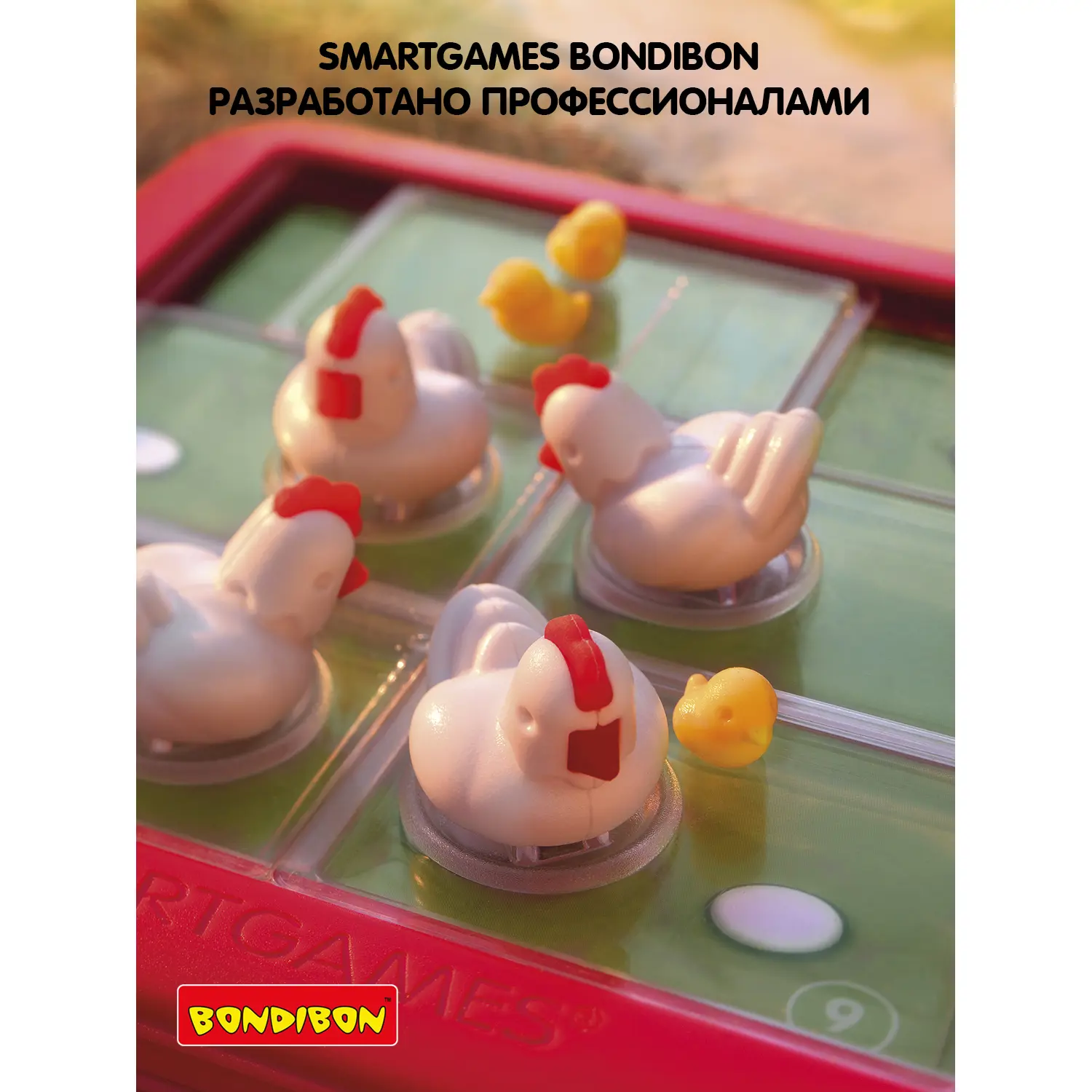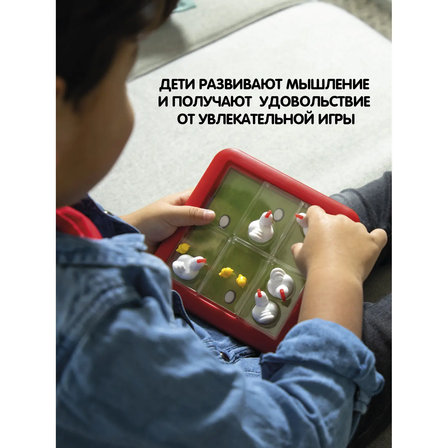 Игра содержит: игровое поле с отсеком для хранения 48 карточек с заданиями, 5 прозрачных деталей головоломки с курочками и цыплятами, листовка с решениями.