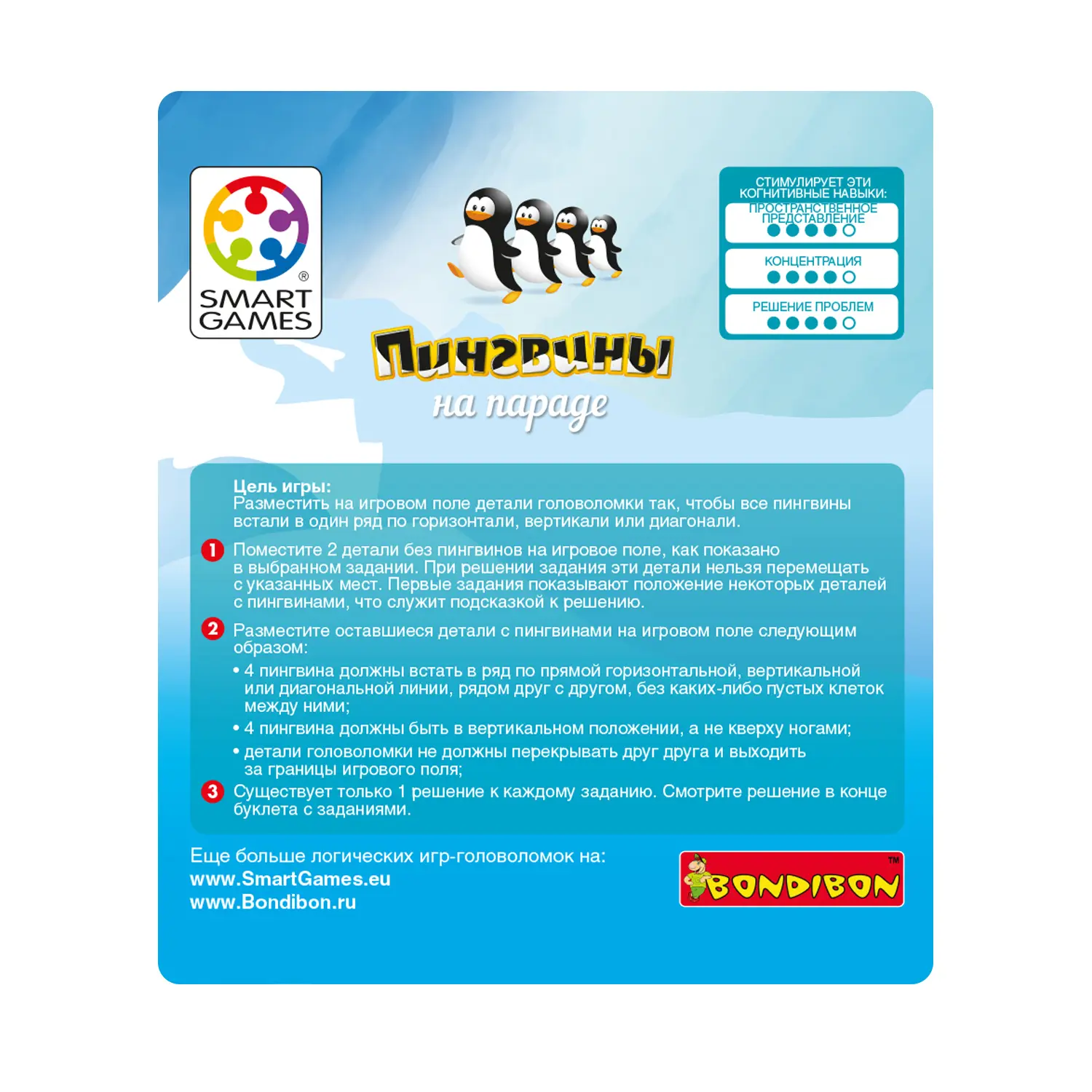 В состав игры входят шесть магнитных деталей-пингвинов и игровое поле с красочным буклетом.