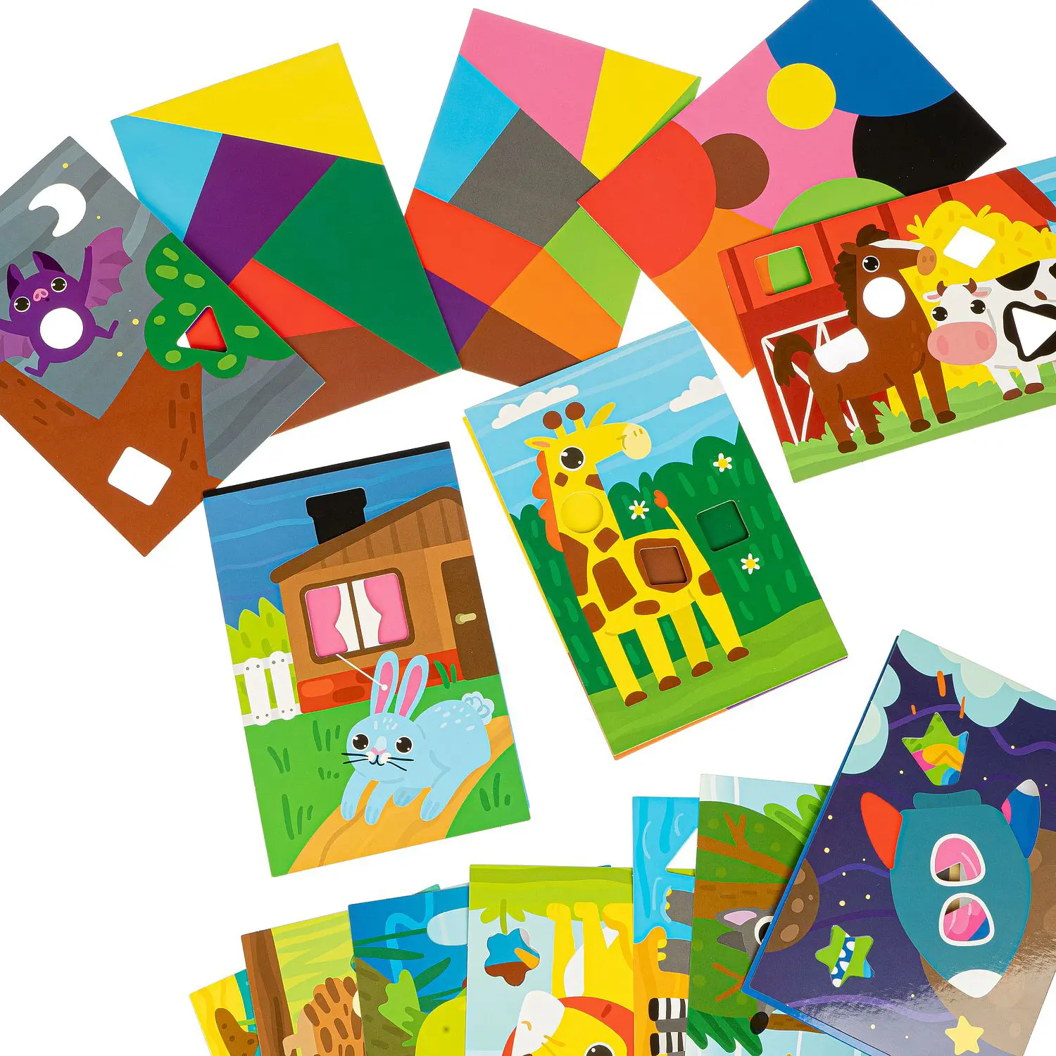 Игра способствует не только изучению основных цветов, но и геометрических фигур, ведь отверстия в рисунках трафаретах имеют различную форму.