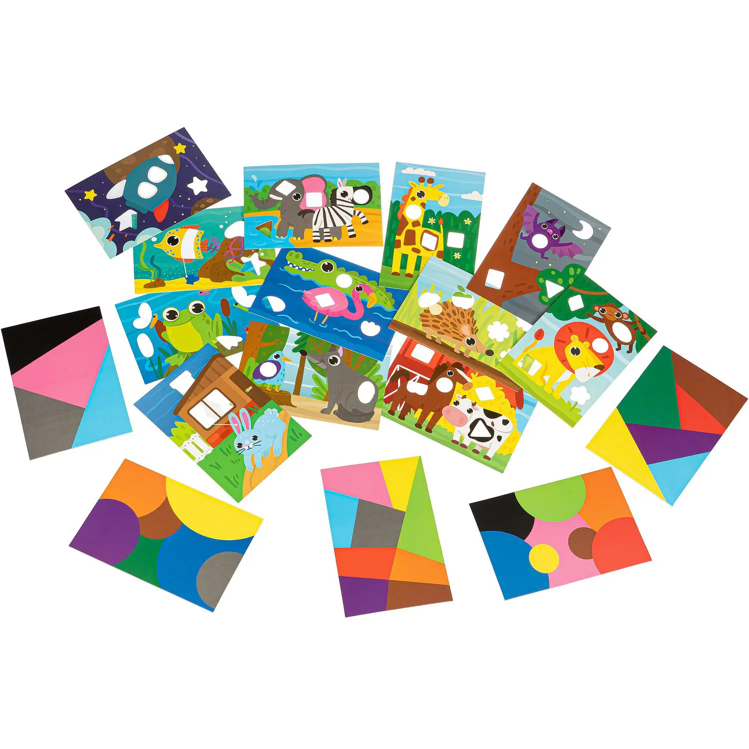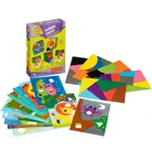 В комплект игры входят: 12 забавных рисунков-трафаретов, в которых пропущены от двух до пяти цветов и 5 универсальных карт с цветными палитрами.