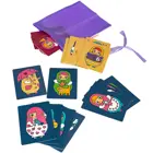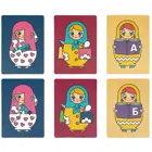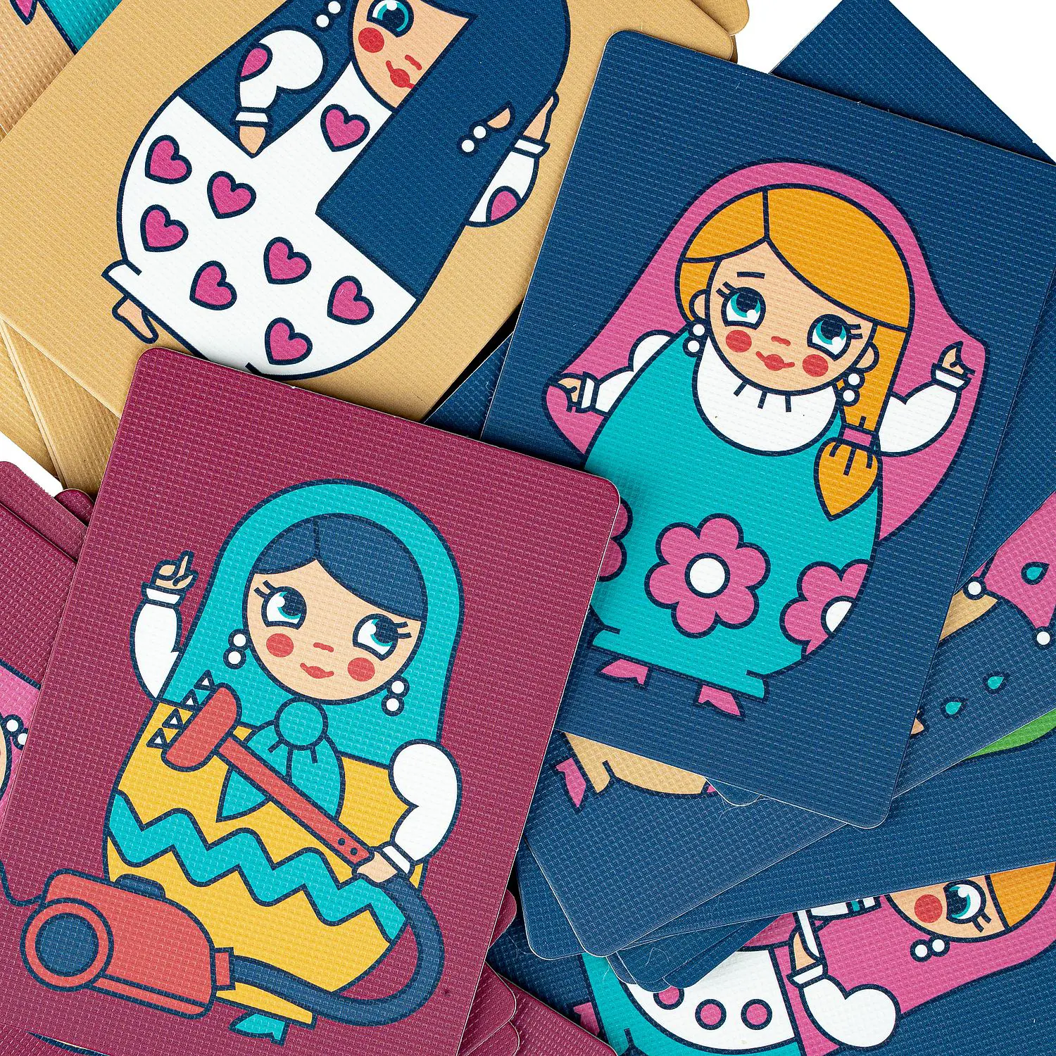 В игровой набор входят: 30 двусторонних игровых карт с изображениями весёлых матрёшек, тканевый мешочек, с которым игру удобно взять с собой в гости или в путешествие.